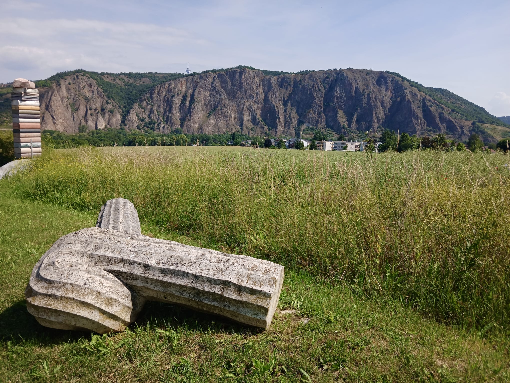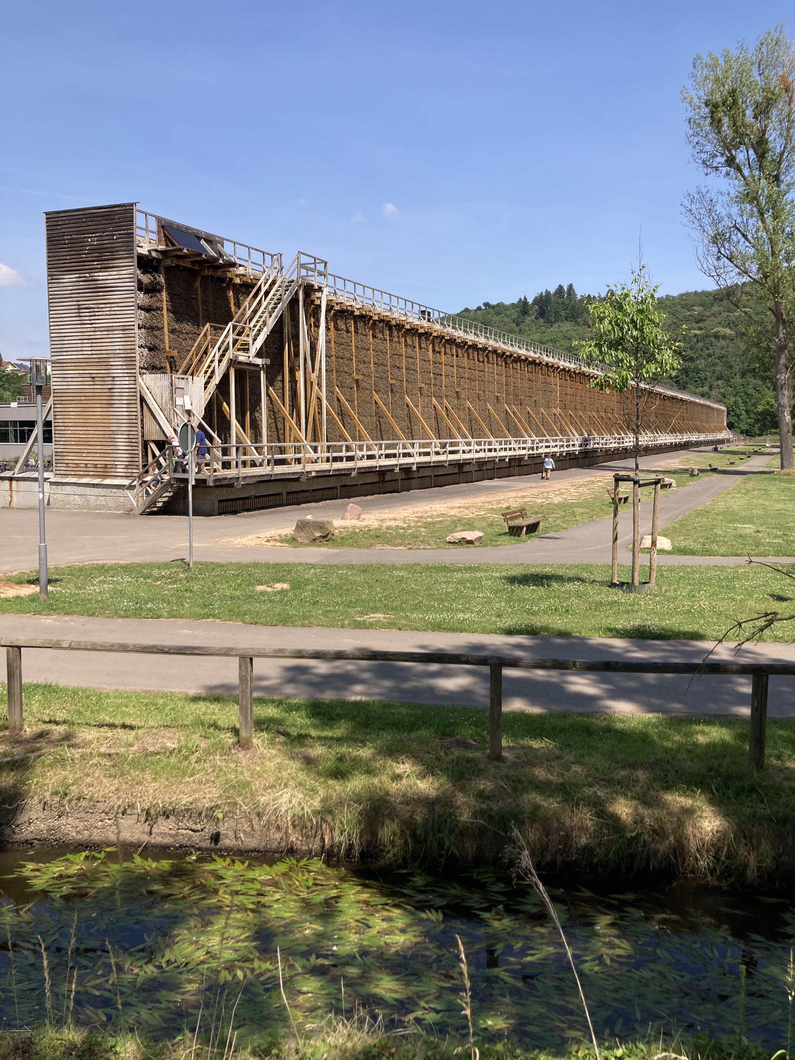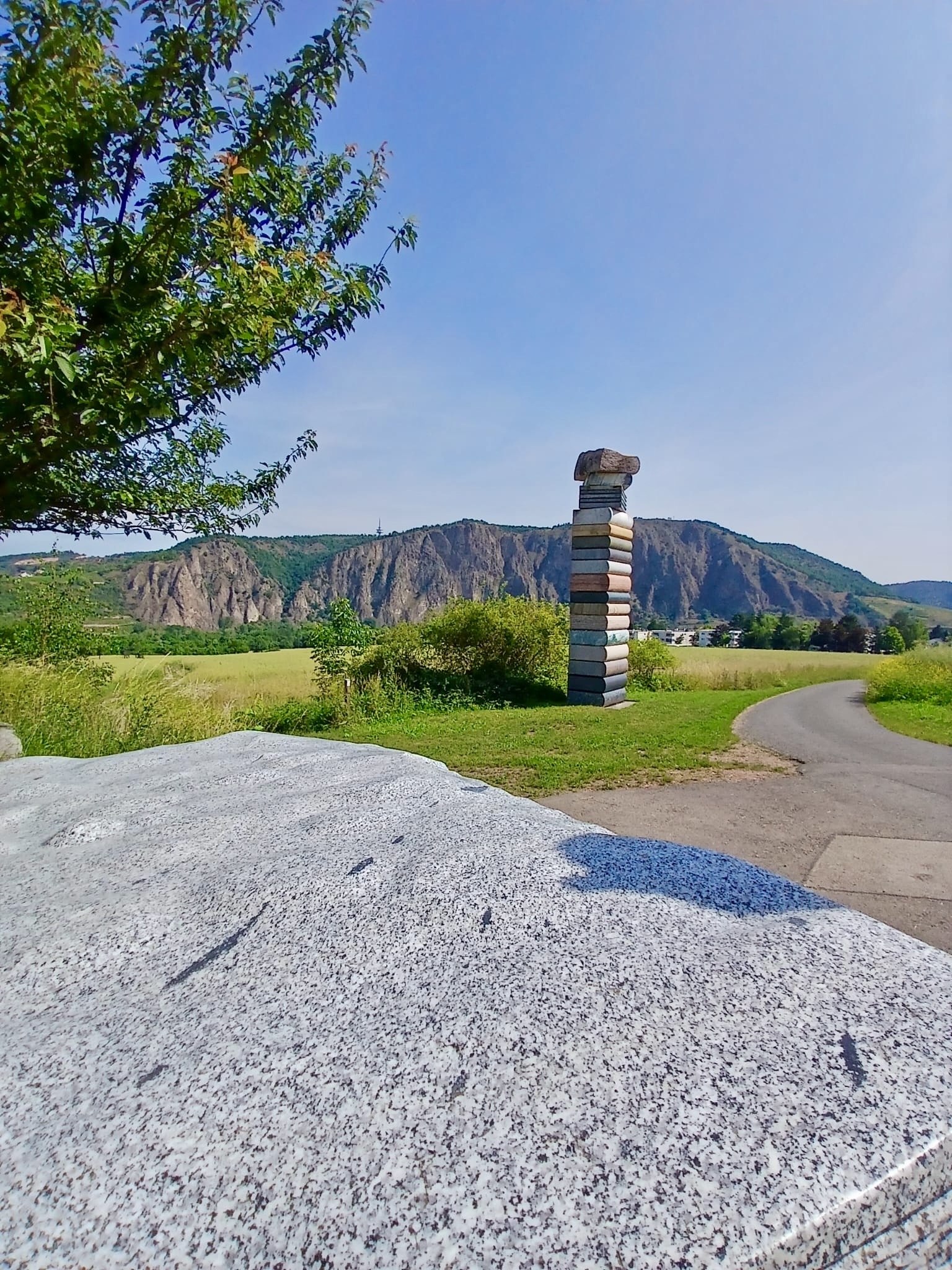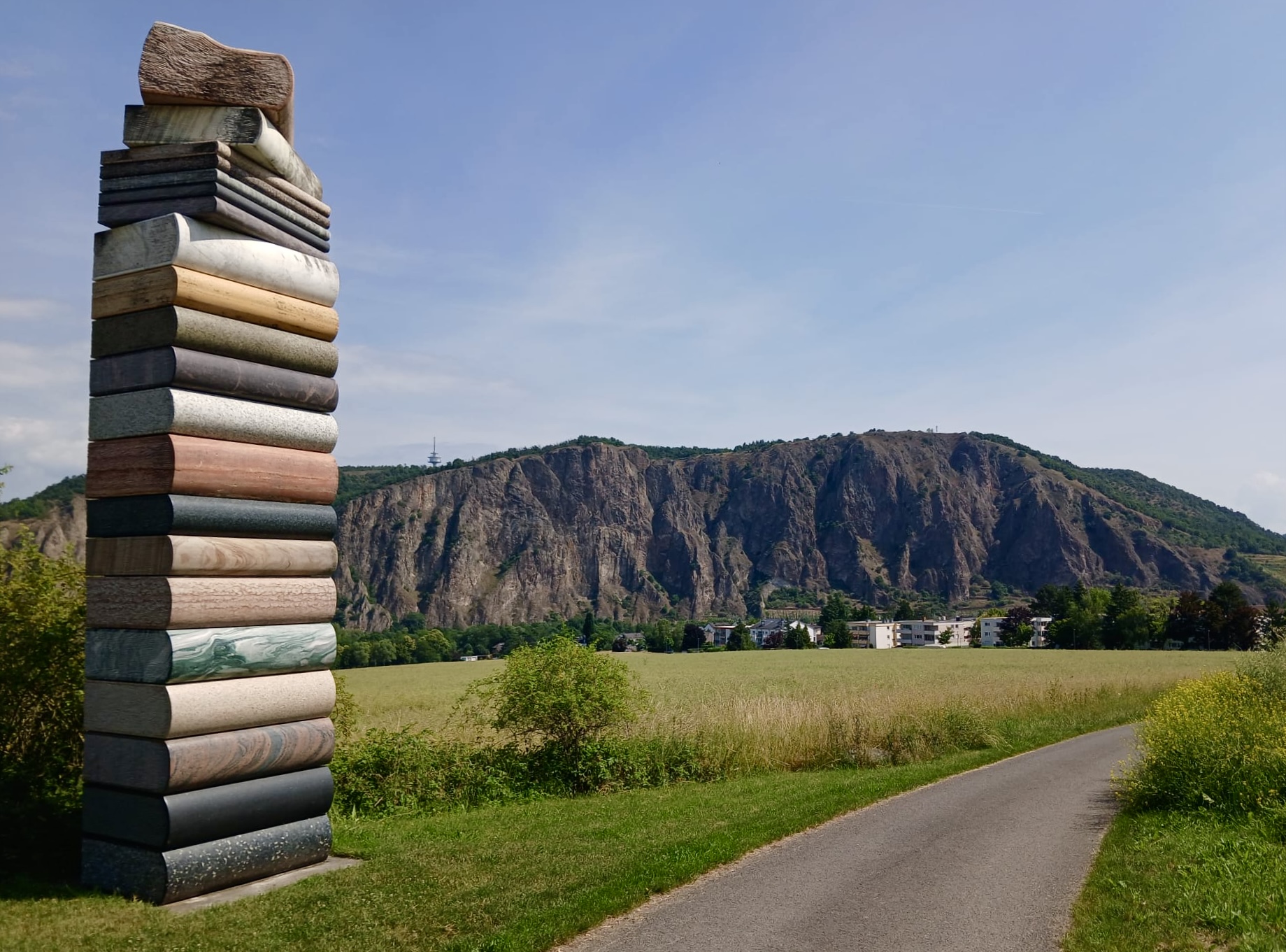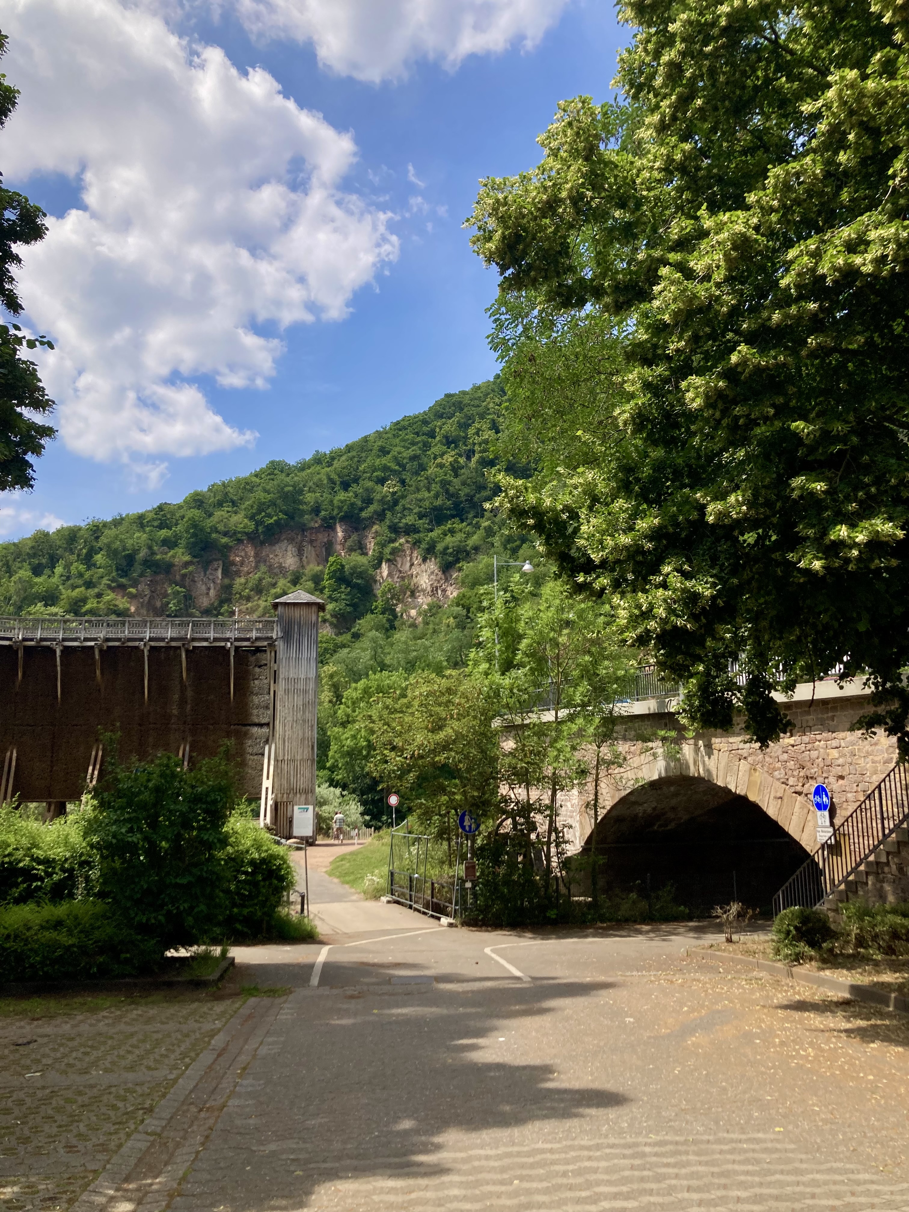 Anderntags haben wir die Stahlpferde gesattelt und sind ins Nachbardorf Bad Münster am Stein geradelt, vorbei an sechs riesigen Gradierwerken (Salzgewinnungs-Anlagen), die teilweise über 100m breit sind und das Tal „versperrten“. Das Ziel war der Steinskulpturen-Park Fondation Kubach-Wilmsen. In einem grossen Park, frei zugänglich und einem Museum, gebaut vom berühmten japanischen Architekten Tadao Ando, haben wir uns herrlich ergötzt an den kunstvollen „Steinblöcken“. Auch die Anfahrten der Nah entlang zeigt uns links und rechts riesige rote Felswände. Selbstverständlich haben wir auch hier eines der schönsten Kurhäuser Europas bewundert, das gerade eine Grossrenovation über sich ergehen lassen muss. Zu guter Letzt haben wir den Bikes noch die Sporen gegeben resp. mehr Pfus und sind zu einem Aussichtspunkt hoch geklettert. Selbstverständlich mit prächtiger Ausblick auf das Nahtal und seine roten Felsen.