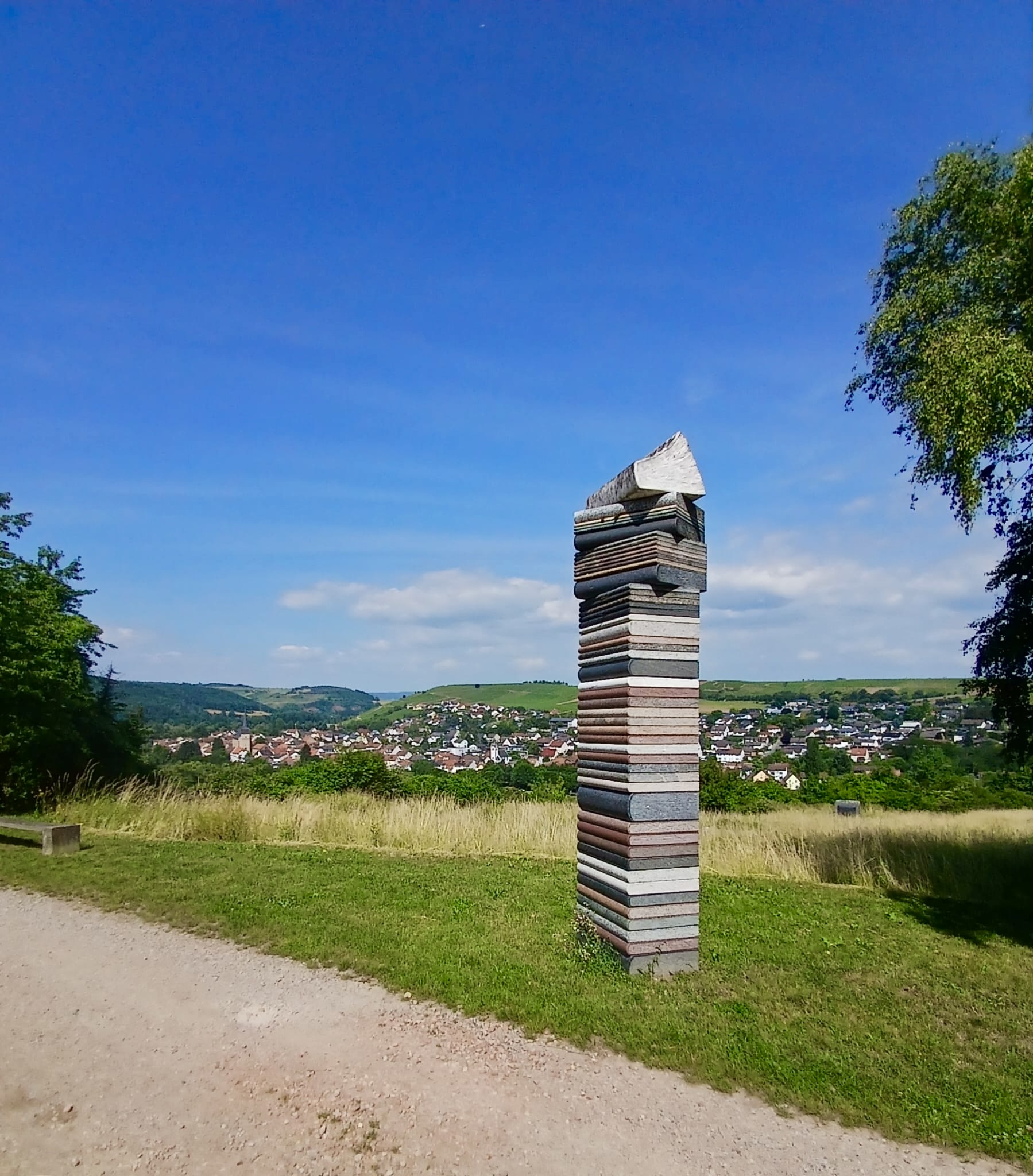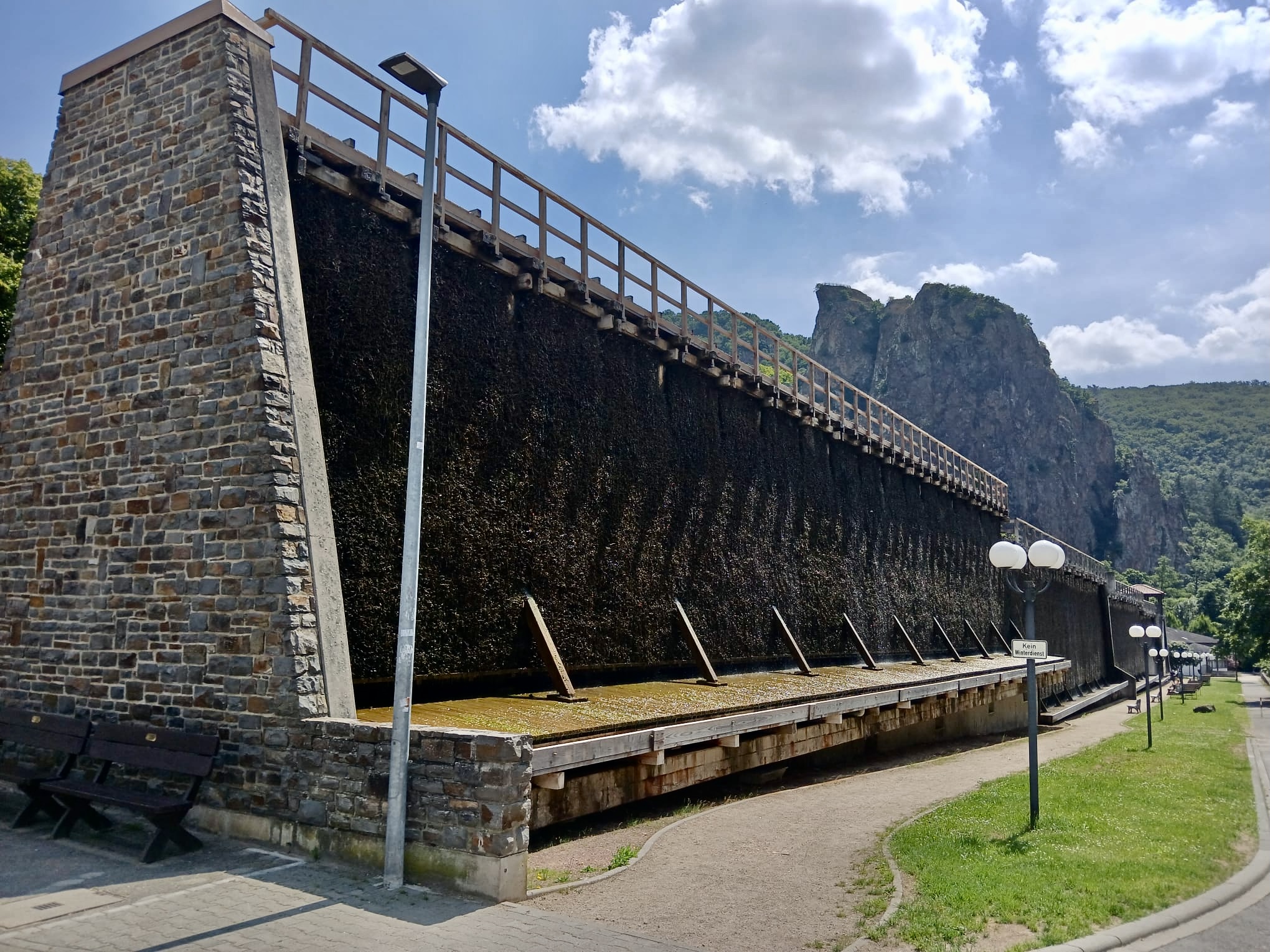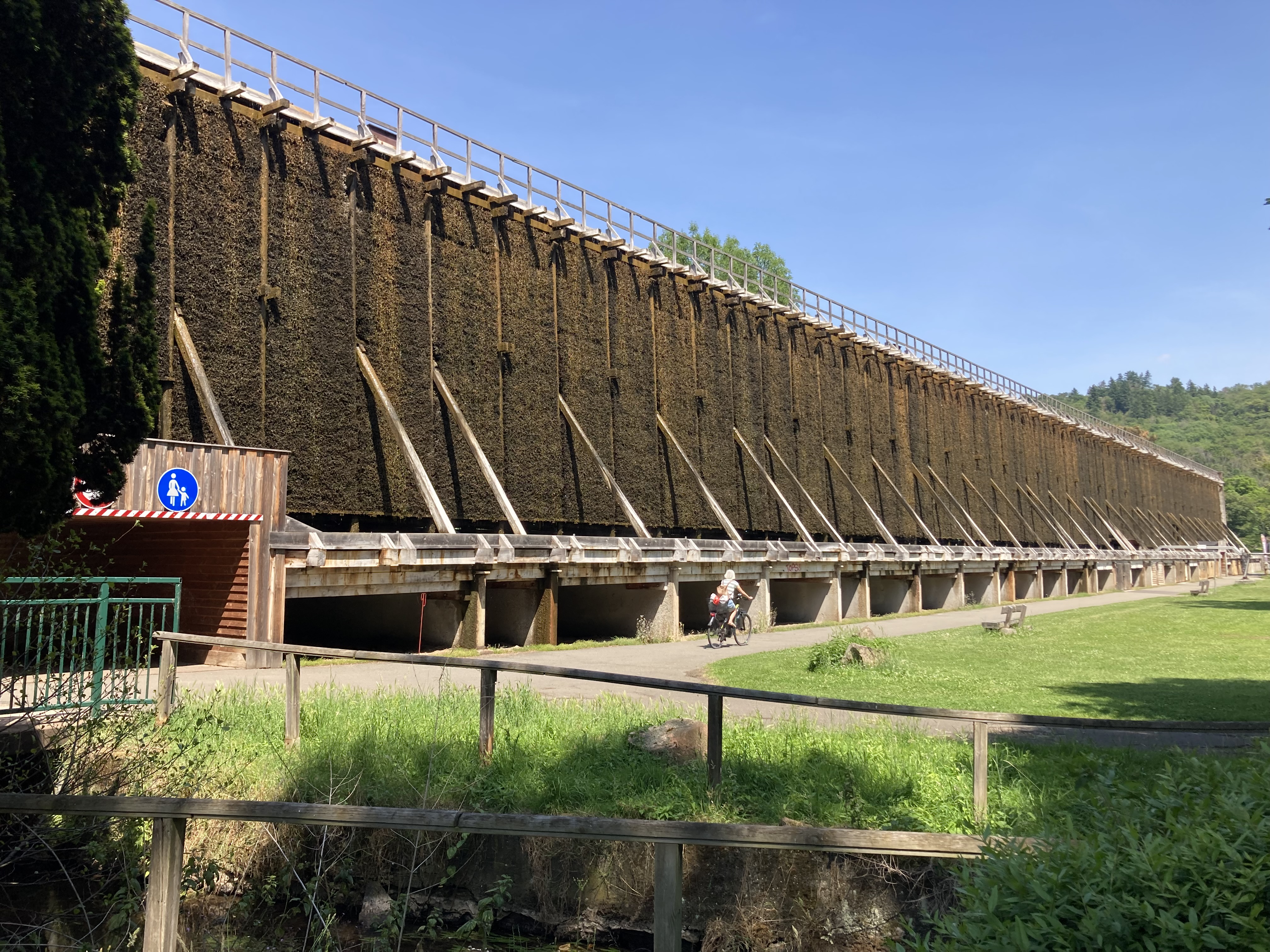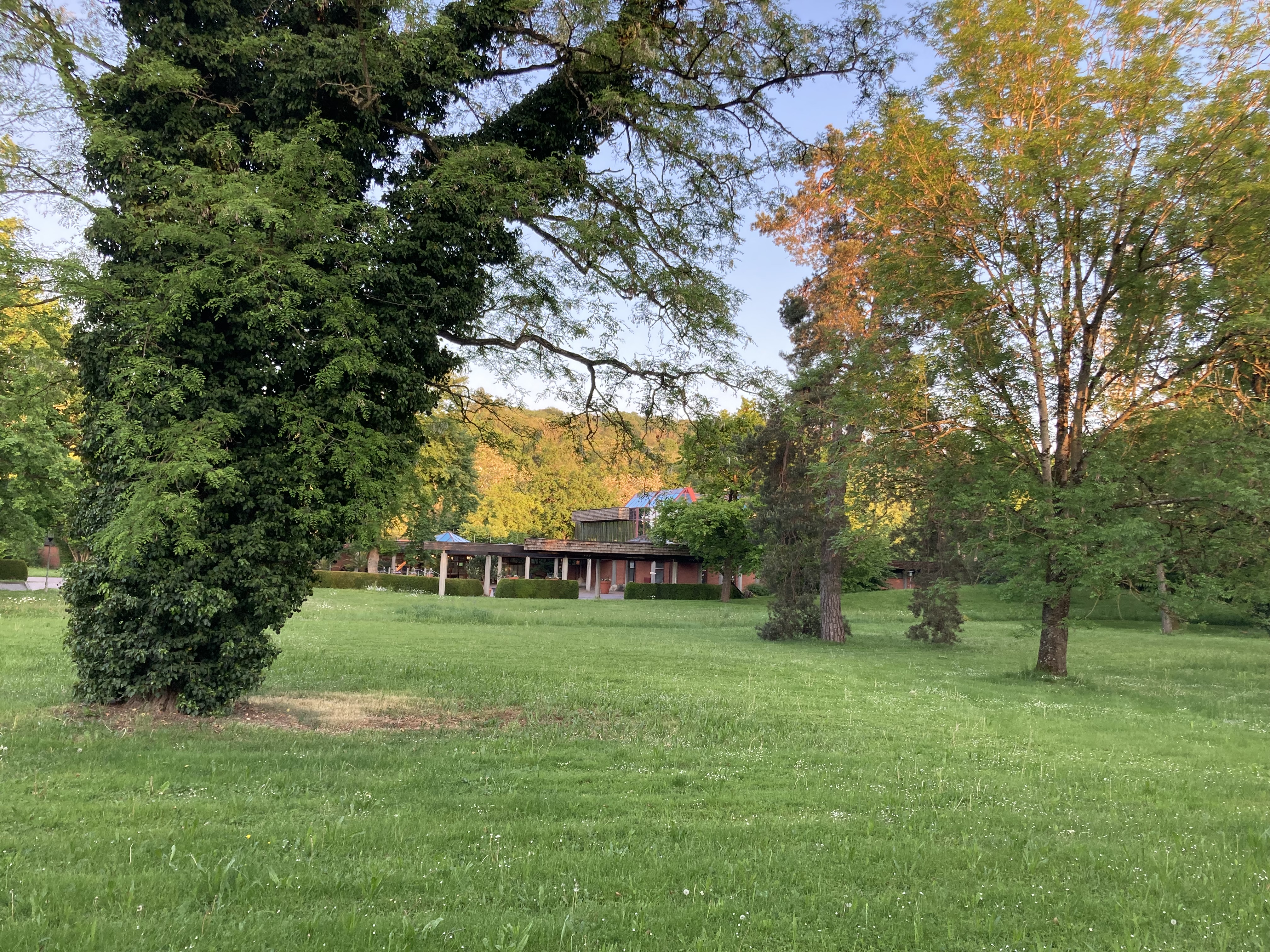 Anderntags haben wir die Stahlpferde gesattelt und sind ins Nachbardorf Bad Münster am Stein geradelt, vorbei an sechs riesigen Gradierwerken (Salzgewinnungs-Anlagen), die teilweise über 100m breit sind und das Tal „versperrten“. Das Ziel war der Steinskulpturen-Park Fondation Kubach-Wilmsen. In einem grossen Park, frei zugänglich und einem Museum, gebaut vom berühmten japanischen Architekten Tadao Ando, haben wir uns herrlich ergötzt an den kunstvollen „Steinblöcken“. Auch die Anfahrten der Nah entlang zeigt uns links und rechts riesige rote Felswände. Selbstverständlich haben wir auch hier eines der schönsten Kurhäuser Europas bewundert, das gerade eine Grossrenovation über sich ergehen lassen muss. Zu guter Letzt haben wir den Bikes noch die Sporen gegeben resp. mehr Pfus und sind zu einem Aussichtspunkt hoch geklettert. Selbstverständlich mit prächtiger Ausblick auf das Nahtal und seine roten Felsen.