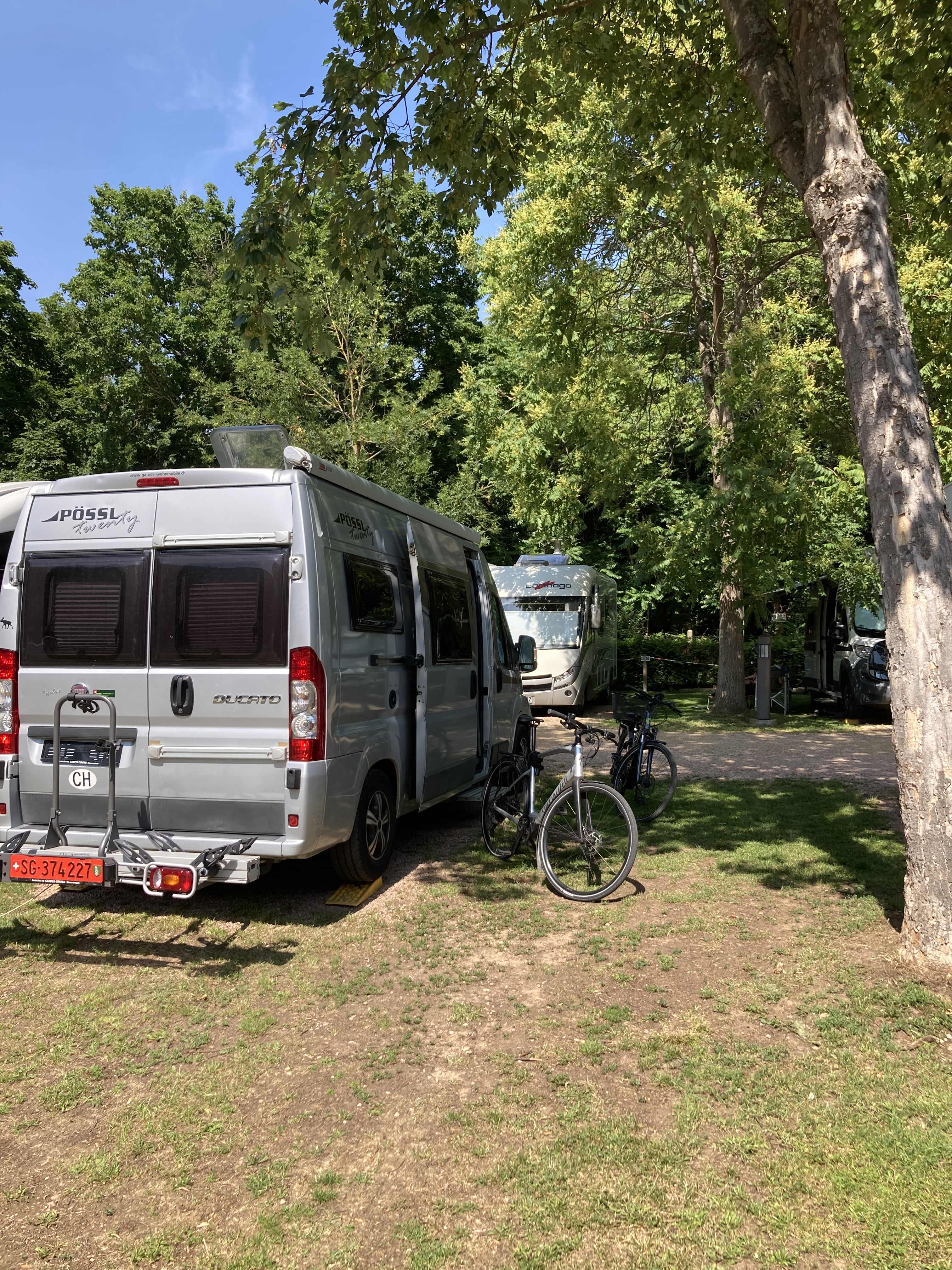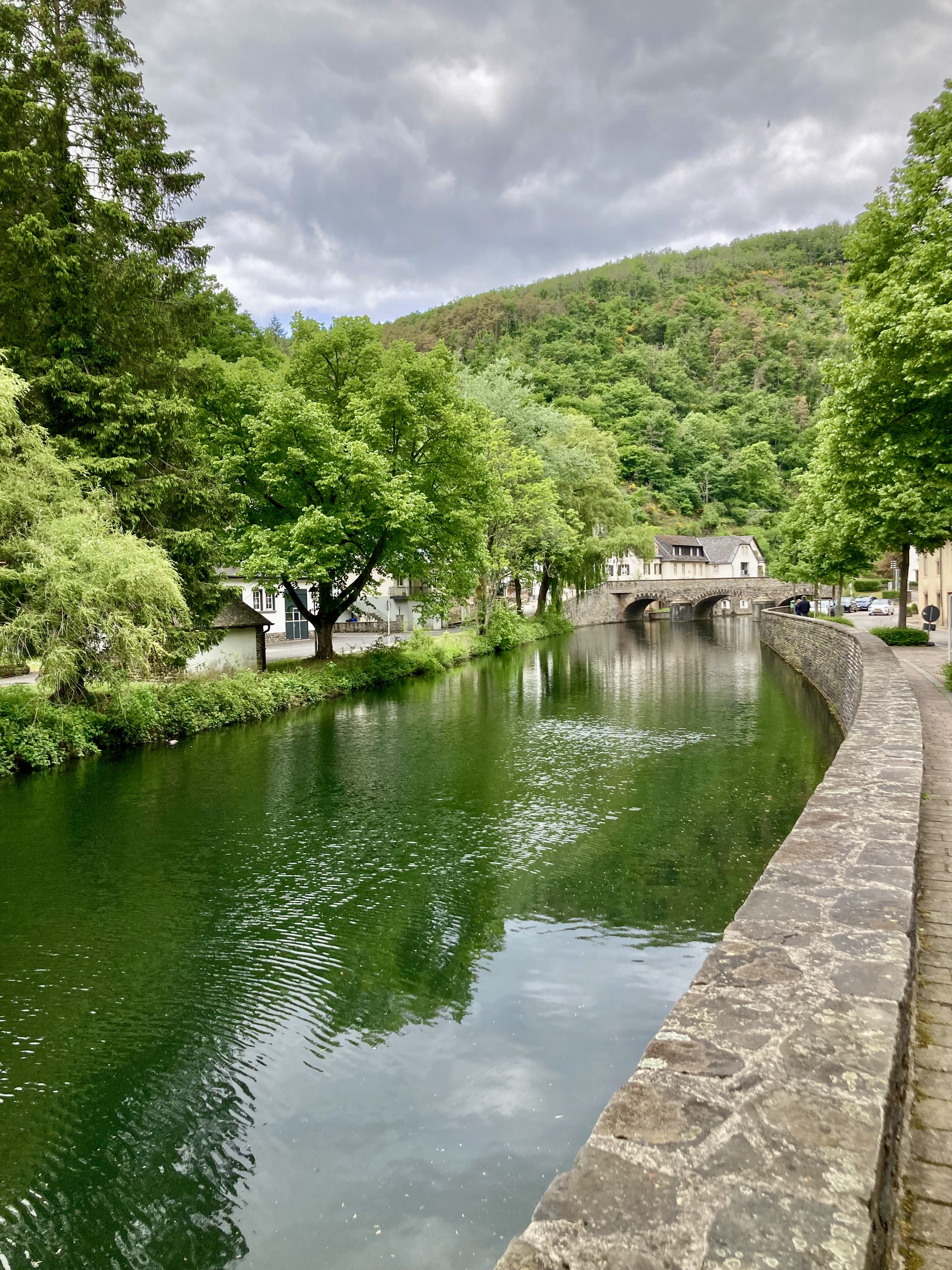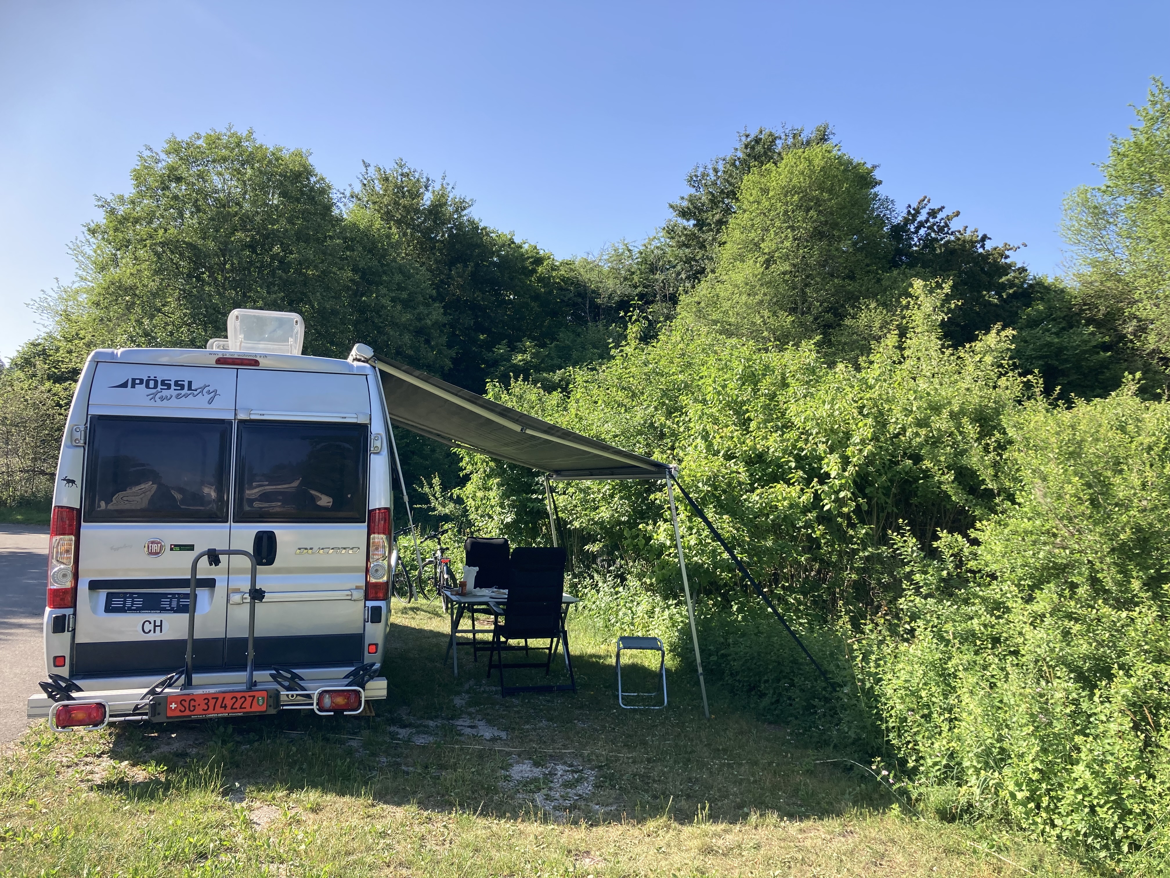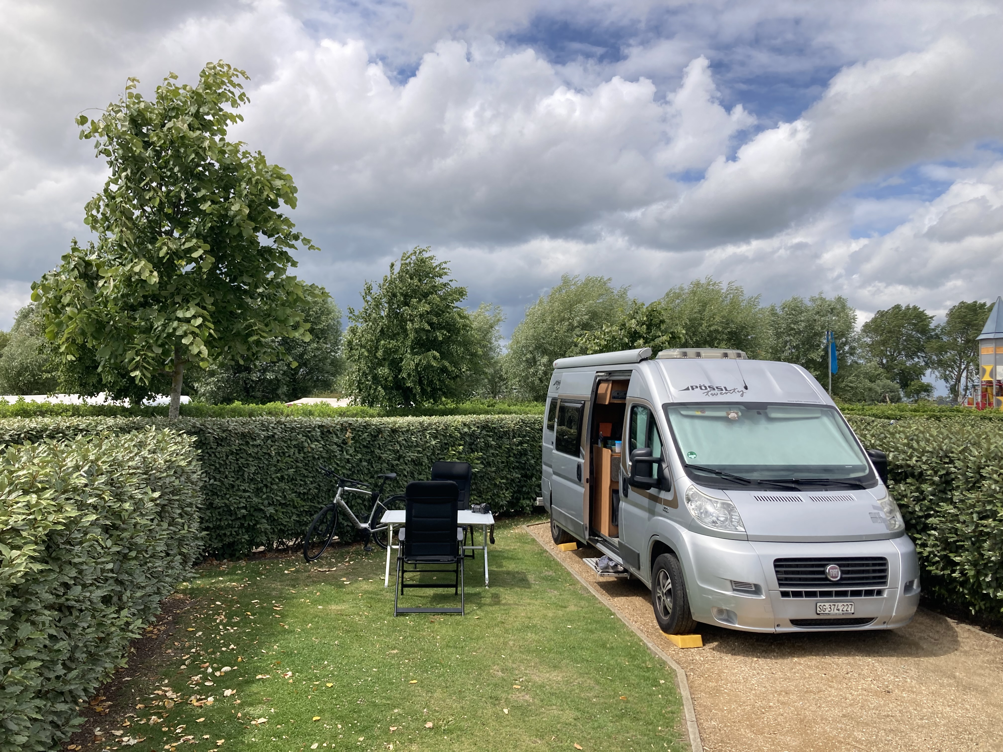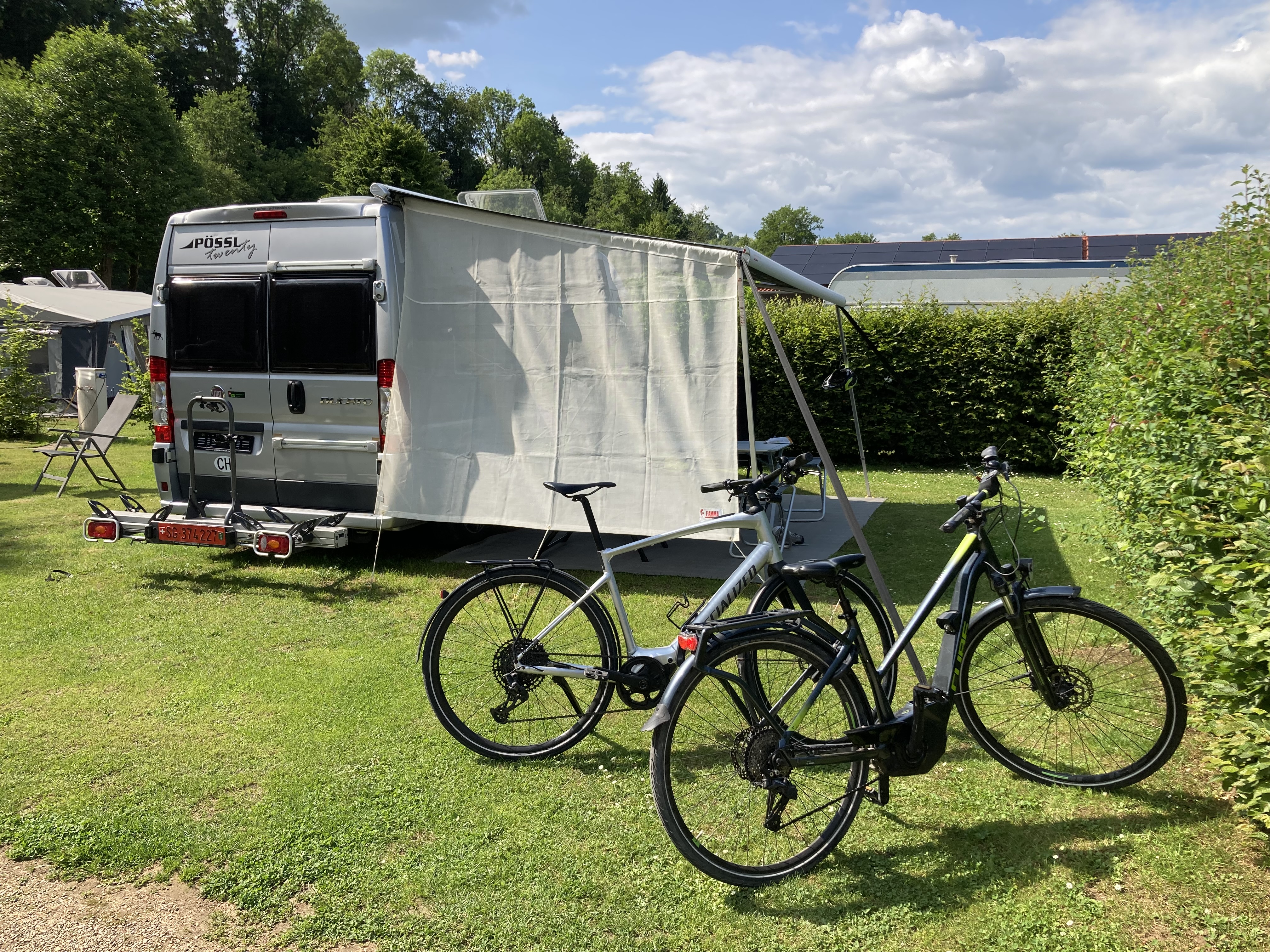 Langsam hatten wir genug Städte gesehen. Darum geht’s über 273 km zurück nach Deutschland in die Südeifel (Rheinland-Pfalz) aufs Land. Ganz in der Nähe von Bitburg entdeckten wir einen wunderschönen Campingplatz in Oberweis mit Pool, grosser Parzelle, Brötchenservice (sehr wichtig!) am Ufer eines Flusses. Über Nacht prasselte ein zünftiges Gewitter über unseren Elvis hinweg und von der Markise stürzt ein Sturzbach auf unseren Vorplatz, wo Frauchen meinte, ich müsse die Markise nachts dringend einziehen – im Pischi… Denkste, die hält… Am Morgen kam dann das Lob von Doris, dass ich das Ding richtig gut und sturmsicher verankert habe. Apropos Wetter: auf der ganzen Reise sind wir nun ca. 3x vom Regen überrascht worden.