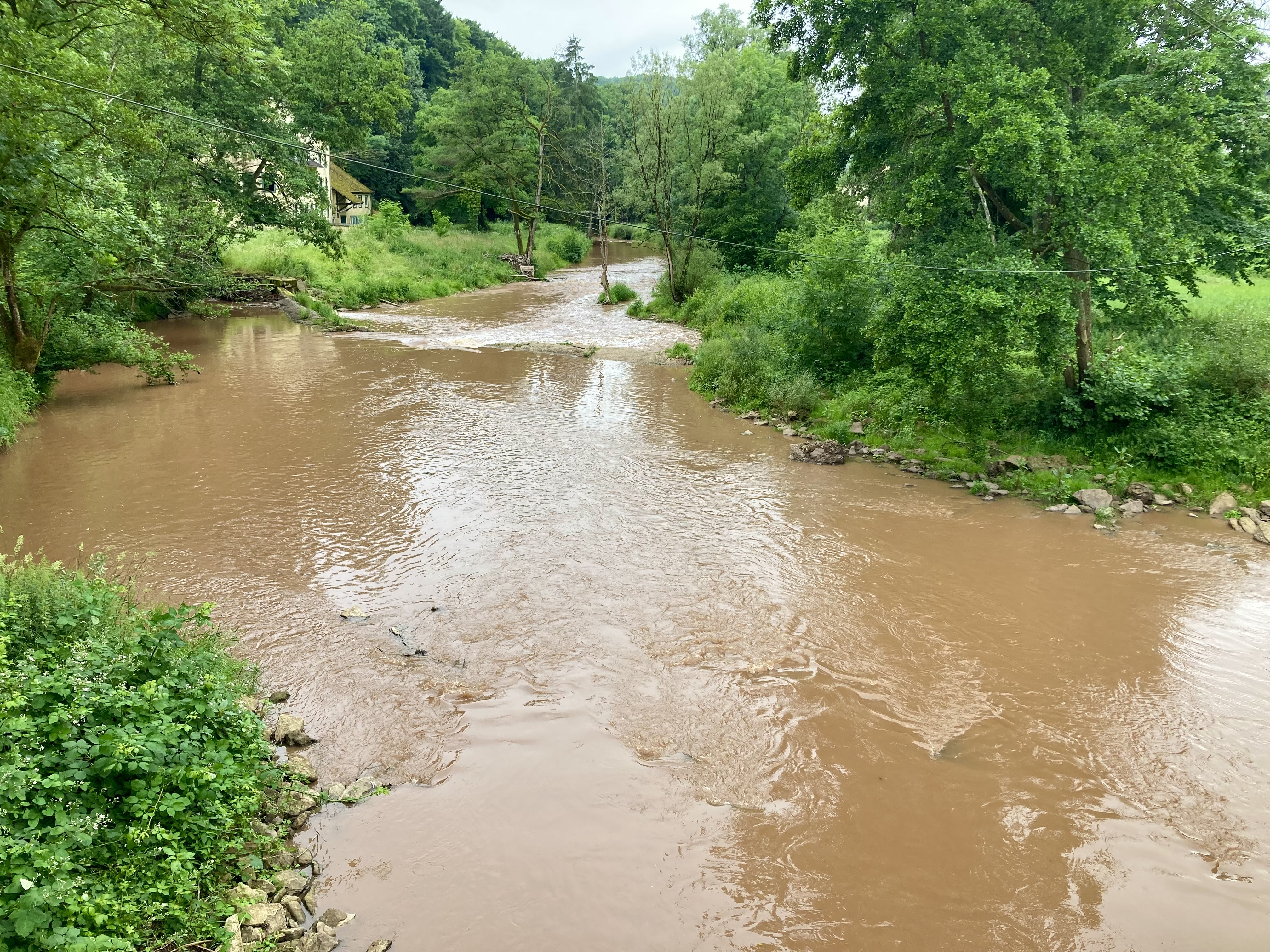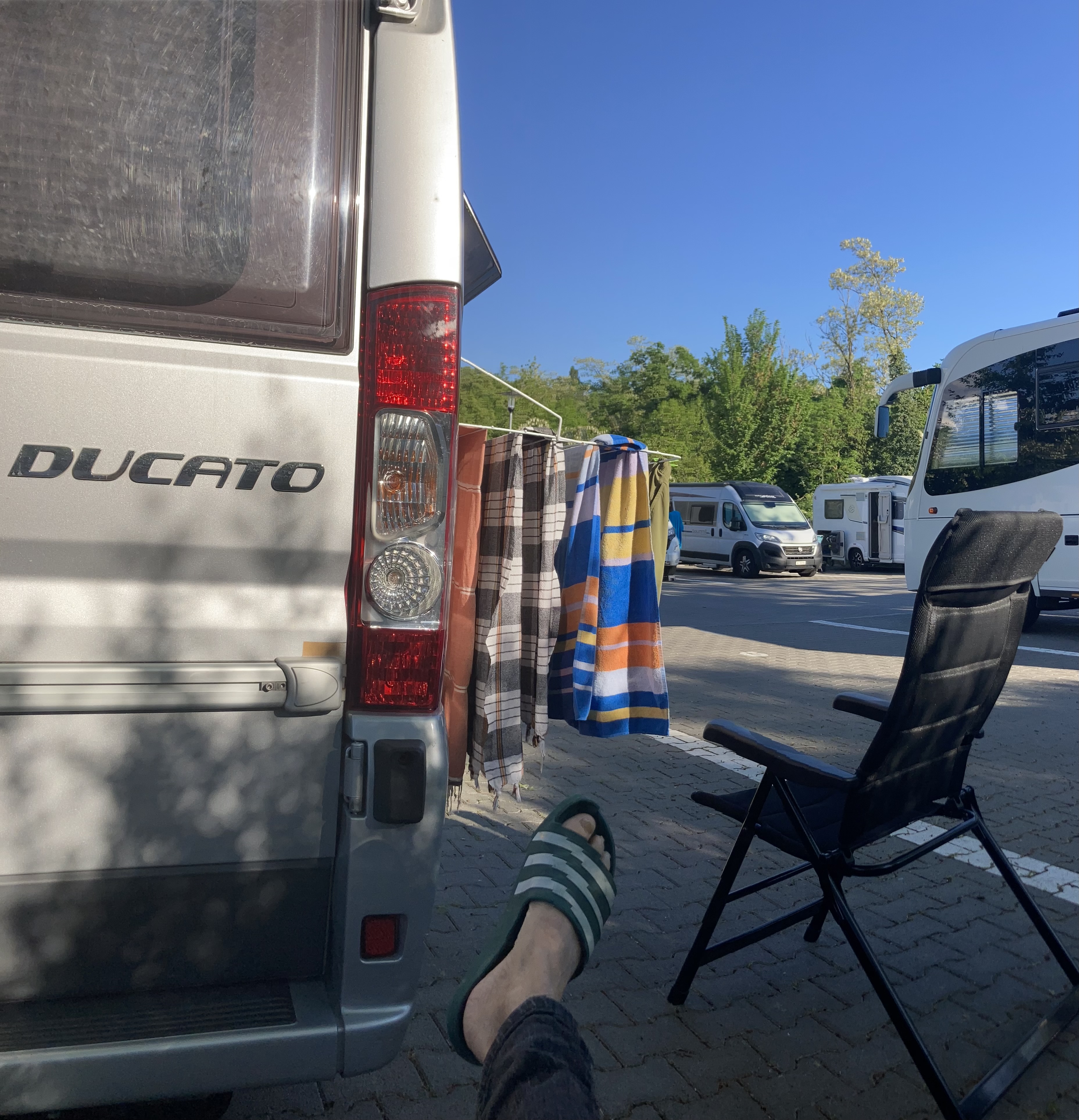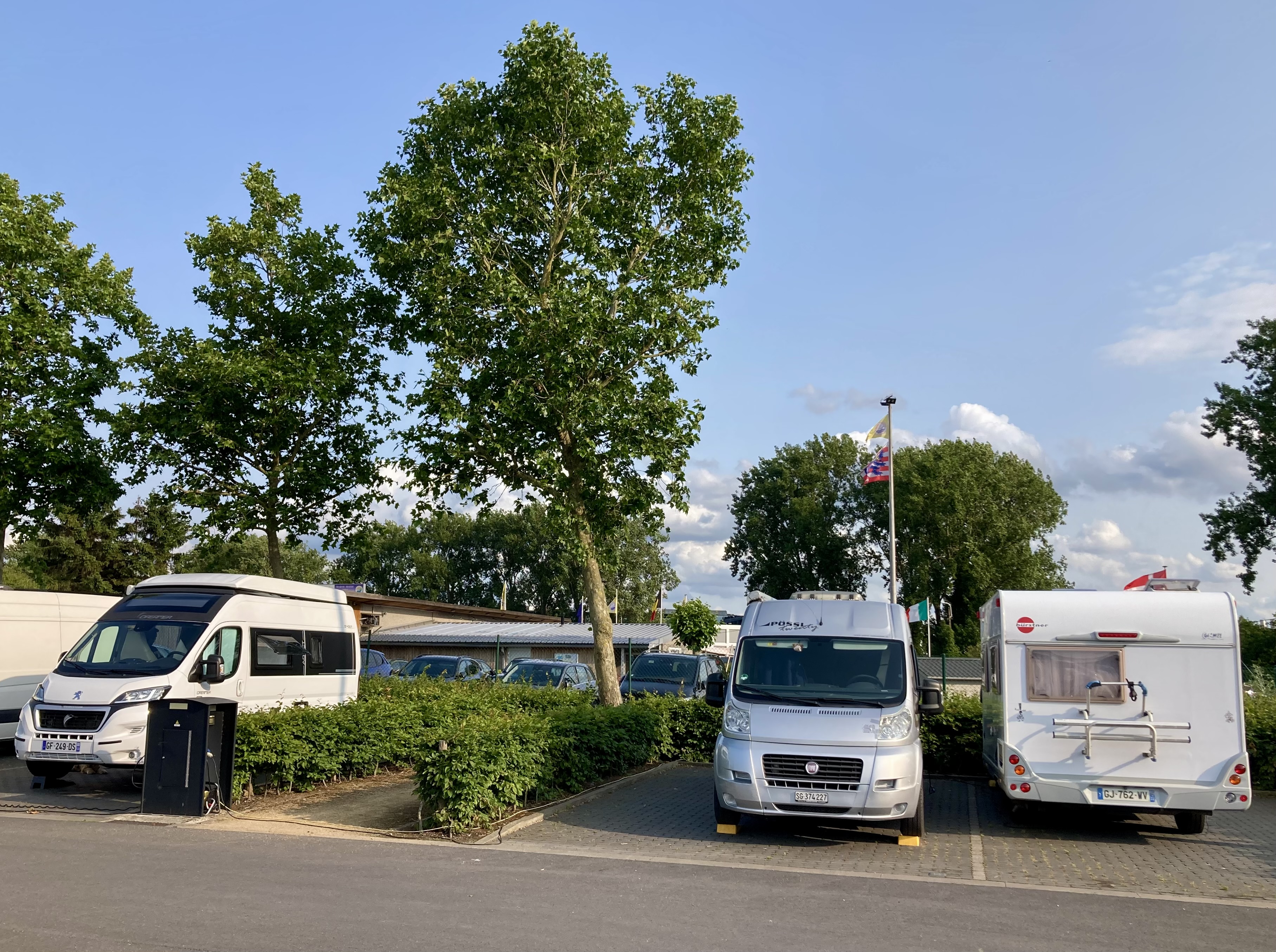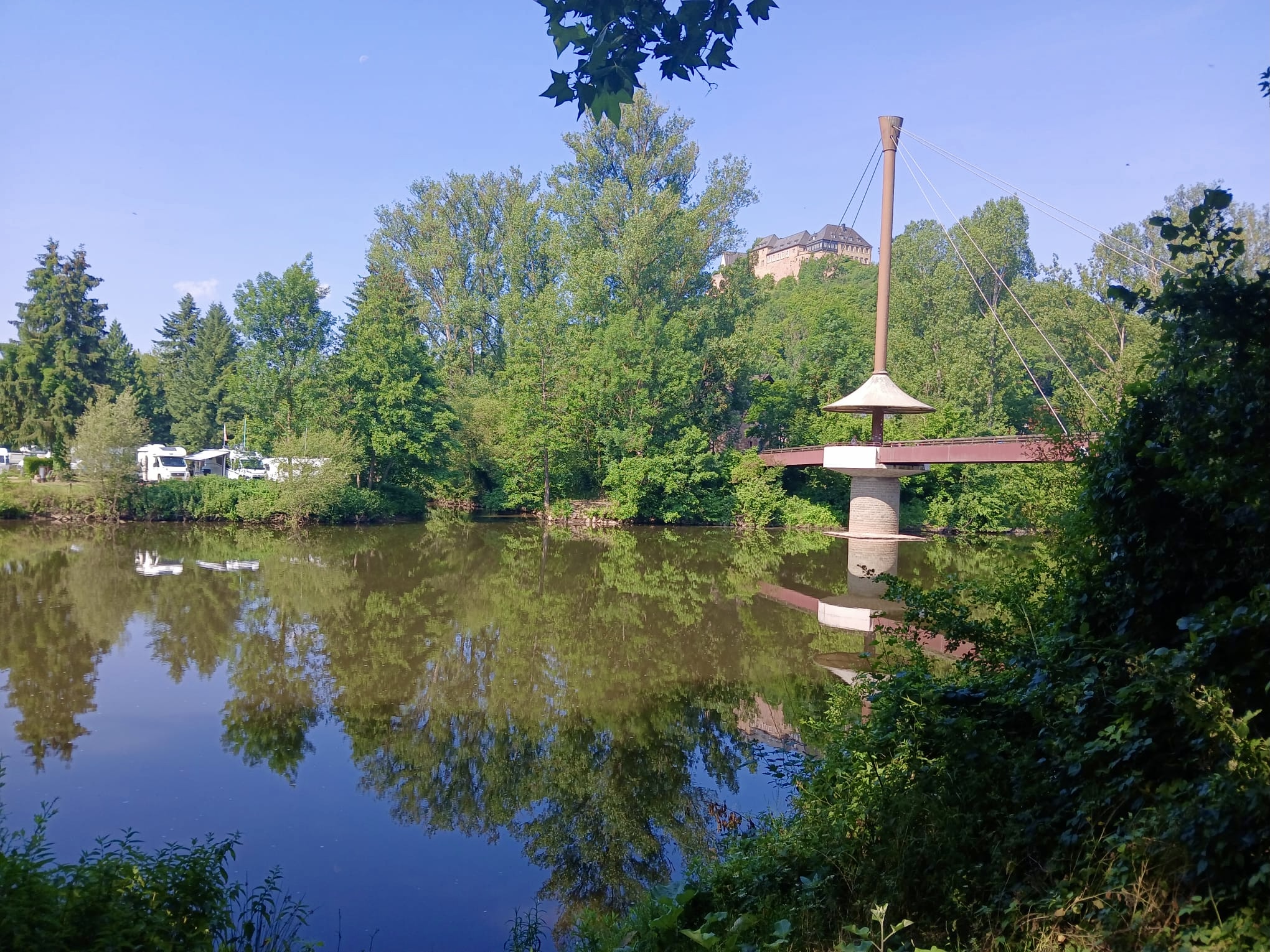 Langsam hatten wir genug Städte gesehen. Darum geht’s über 273 km zurück nach Deutschland in die Südeifel (Rheinland-Pfalz) aufs Land. Ganz in der Nähe von Bitburg entdeckten wir einen wunderschönen Campingplatz in Oberweis mit Pool, grosser Parzelle, Brötchenservice (sehr wichtig!) am Ufer eines Flusses. Über Nacht prasselte ein zünftiges Gewitter über unseren Elvis hinweg und von der Markise stürzt ein Sturzbach auf unseren Vorplatz, wo Frauchen meinte, ich müsse die Markise nachts dringend einziehen – im Pischi… Denkste, die hält… Am Morgen kam dann das Lob von Doris, dass ich das Ding richtig gut und sturmsicher verankert habe. Apropos Wetter: auf der ganzen Reise sind wir nun ca. 3x vom Regen überrascht worden.