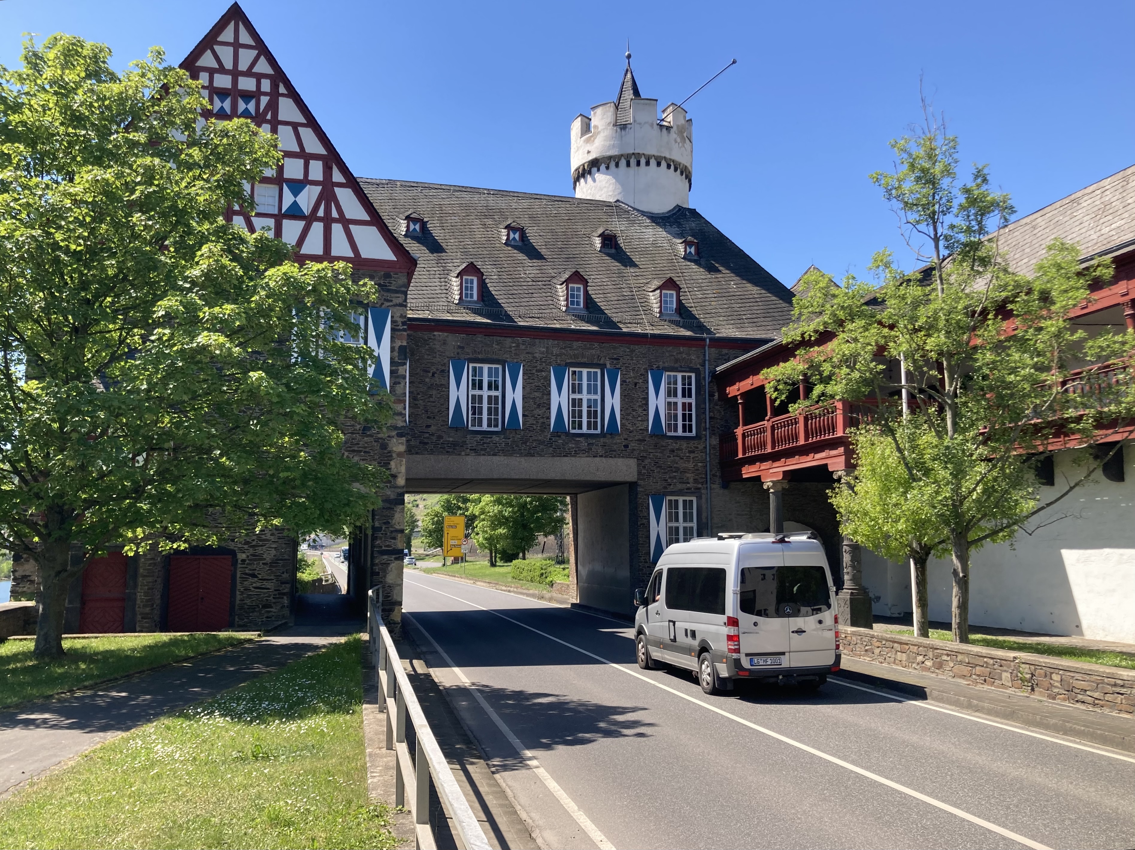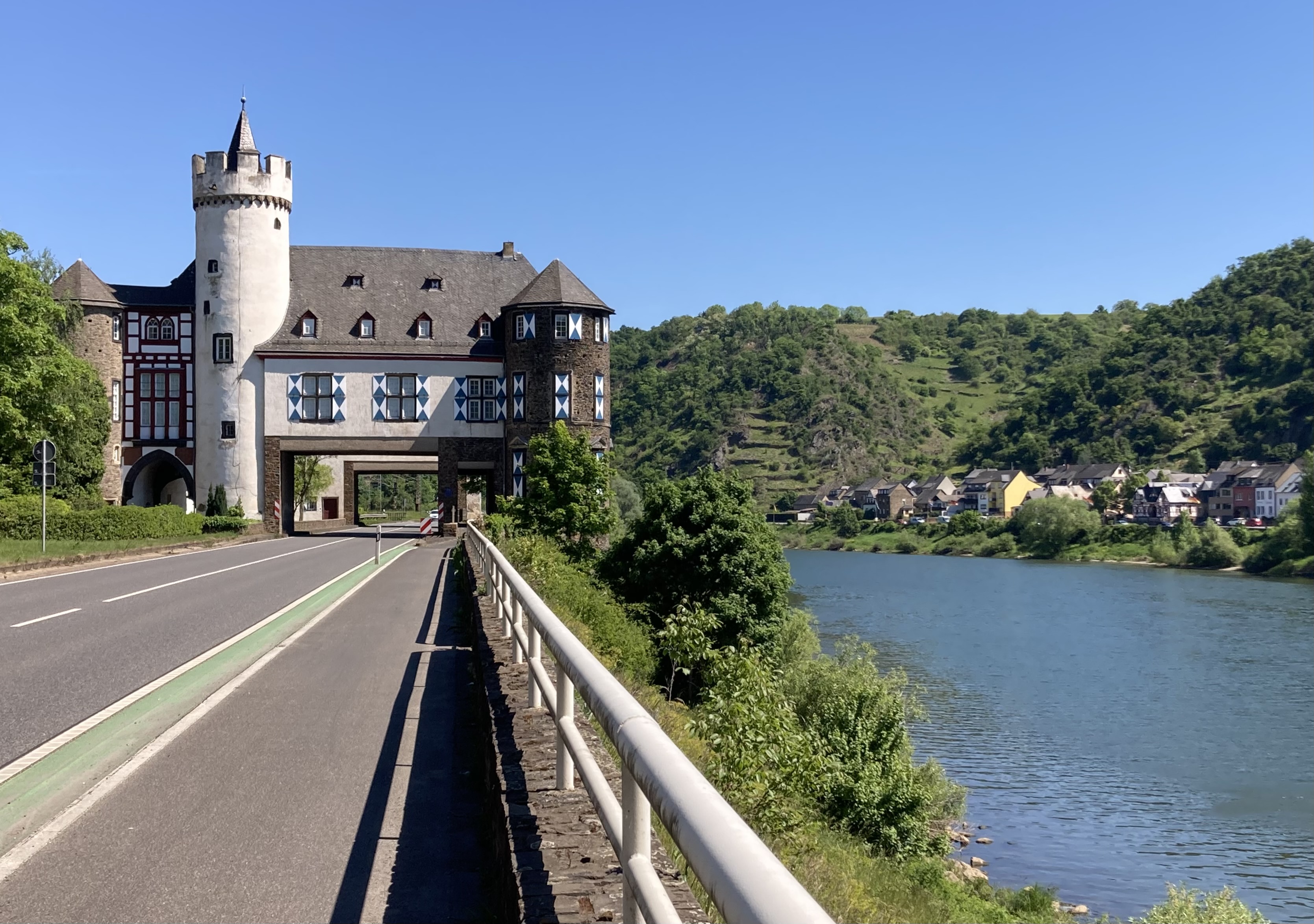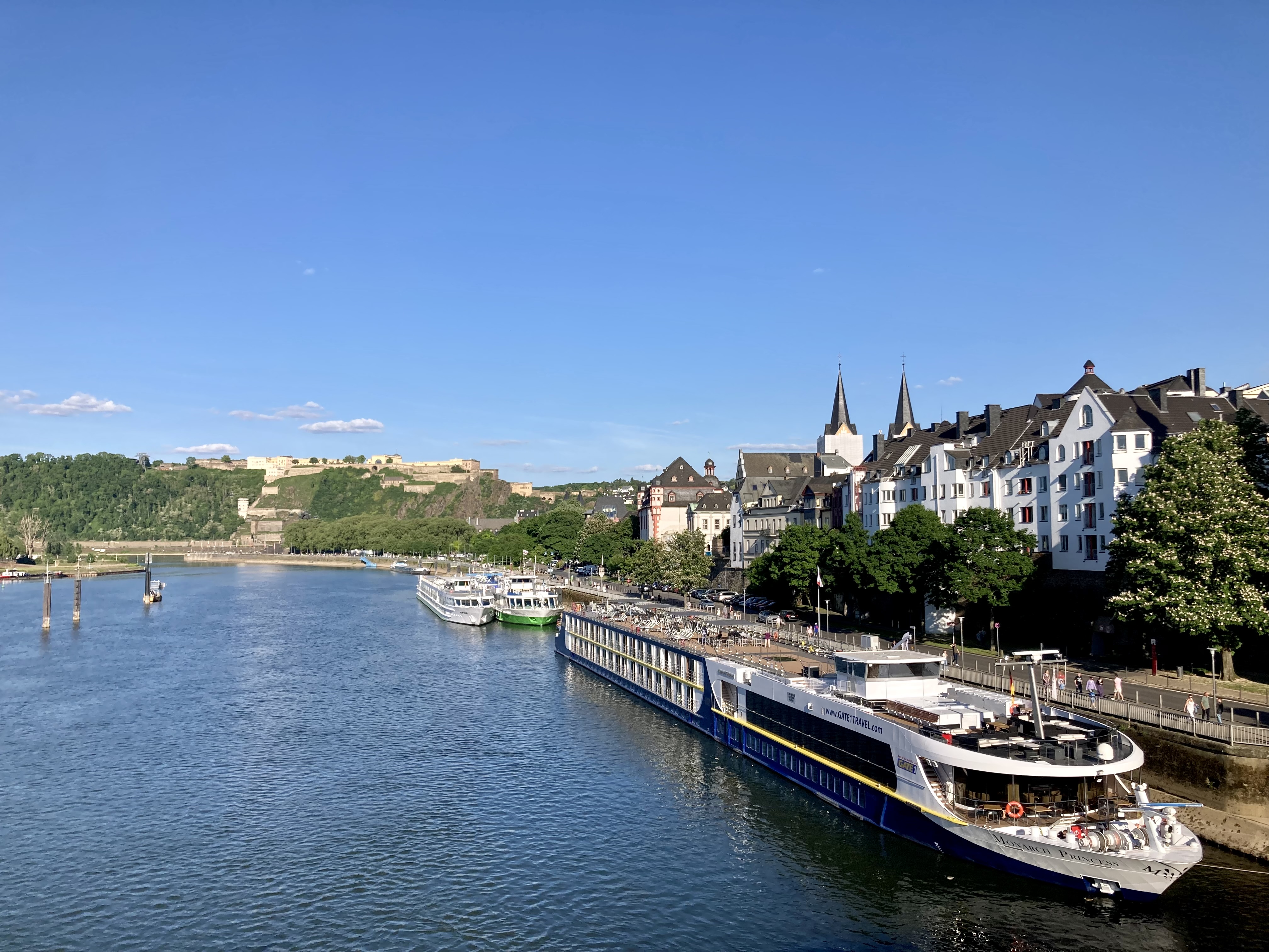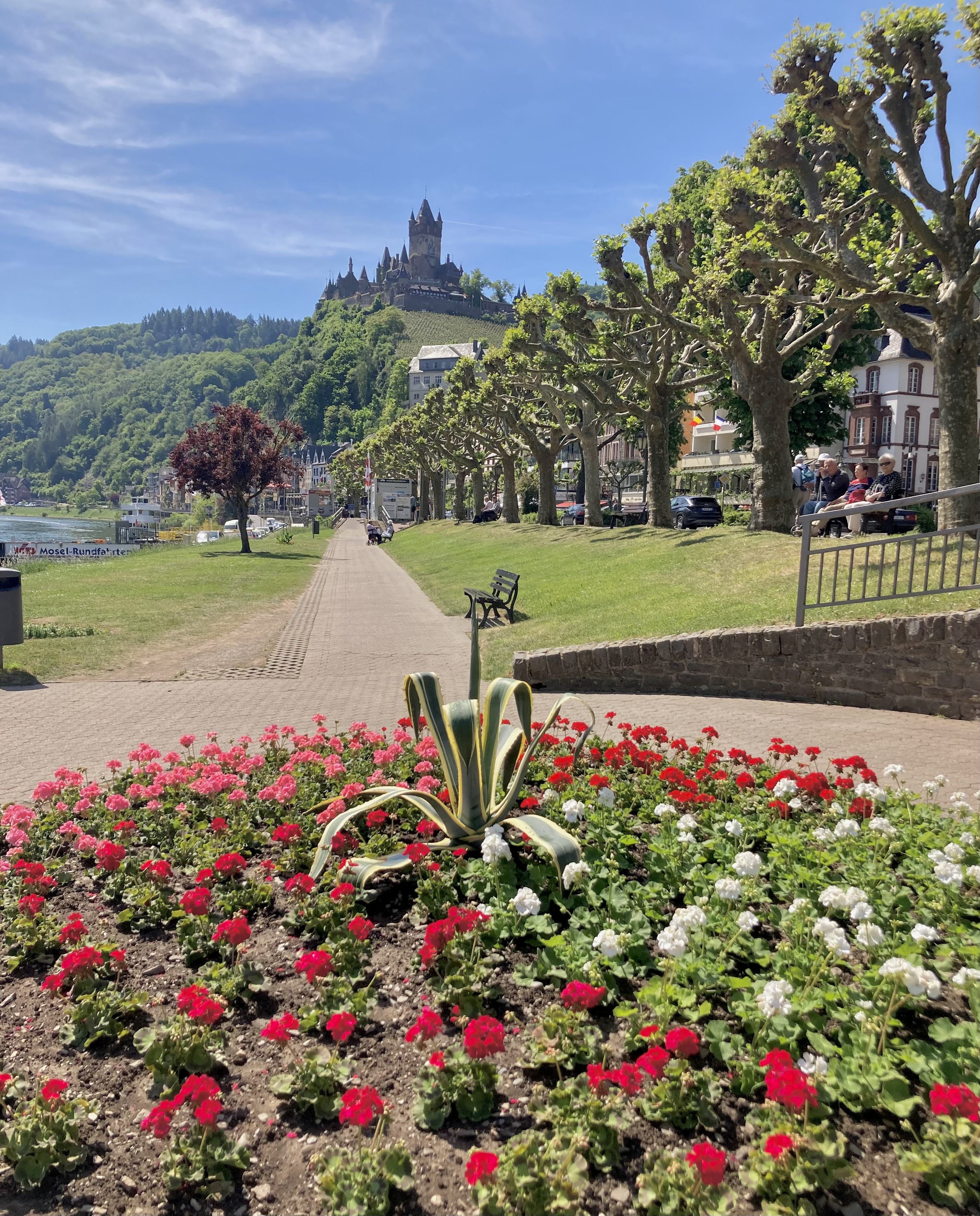 Nach zwei Tagen ging es dann hoch über fast 400 km nach Koblenz zum eigentlichen Start an der Mosel. Eindrückliche Stadt am Deutschen Eck, dem Zusammenfluss von Mosel und Rhein. Der Stellplatz lag etwas ausserhalb der Stadt, doch auf dem Veloweg waren wir in 20 Minuten im Zentrum. Logisch steuerten wir zuerst das Deutsche Eck an. Bestaunten die vielen Touristen, Rhein- und Moselkreuzfahrtschiffe, um uns dann den Details in der Innenstadt zuzuwenden. Wir entdeckten ein kubanisches Restaurant, wo uns das Abendessen bestens mundete. Anderntags strampelten wir hoch zur Burg Ehrenbreitstein, obwohl eine Gondelbahn hinaufführte. Ein prächtiger Spot hoch über Koblenz mit bestem Blick auf das Deutsche Eck und das Umland.