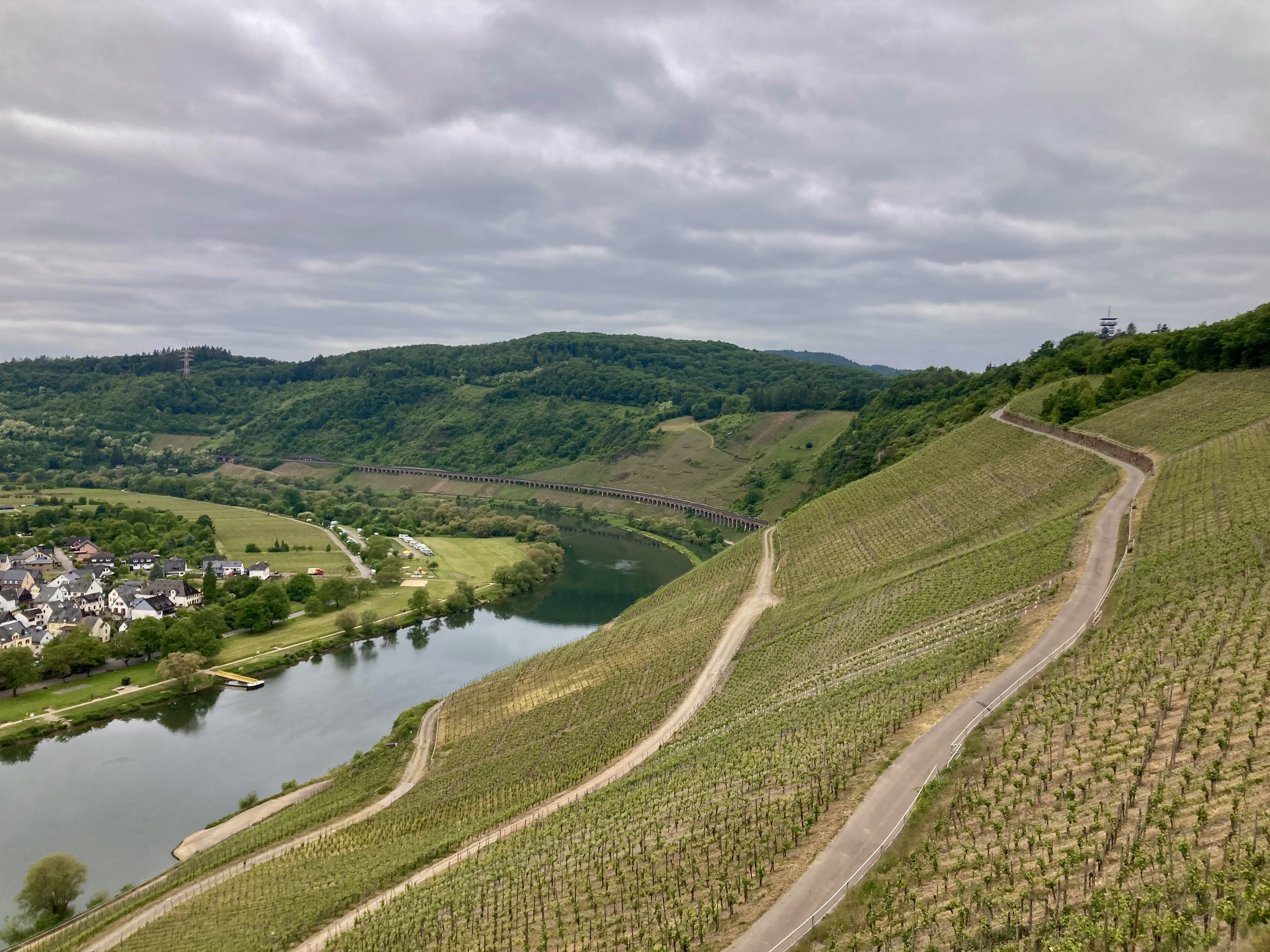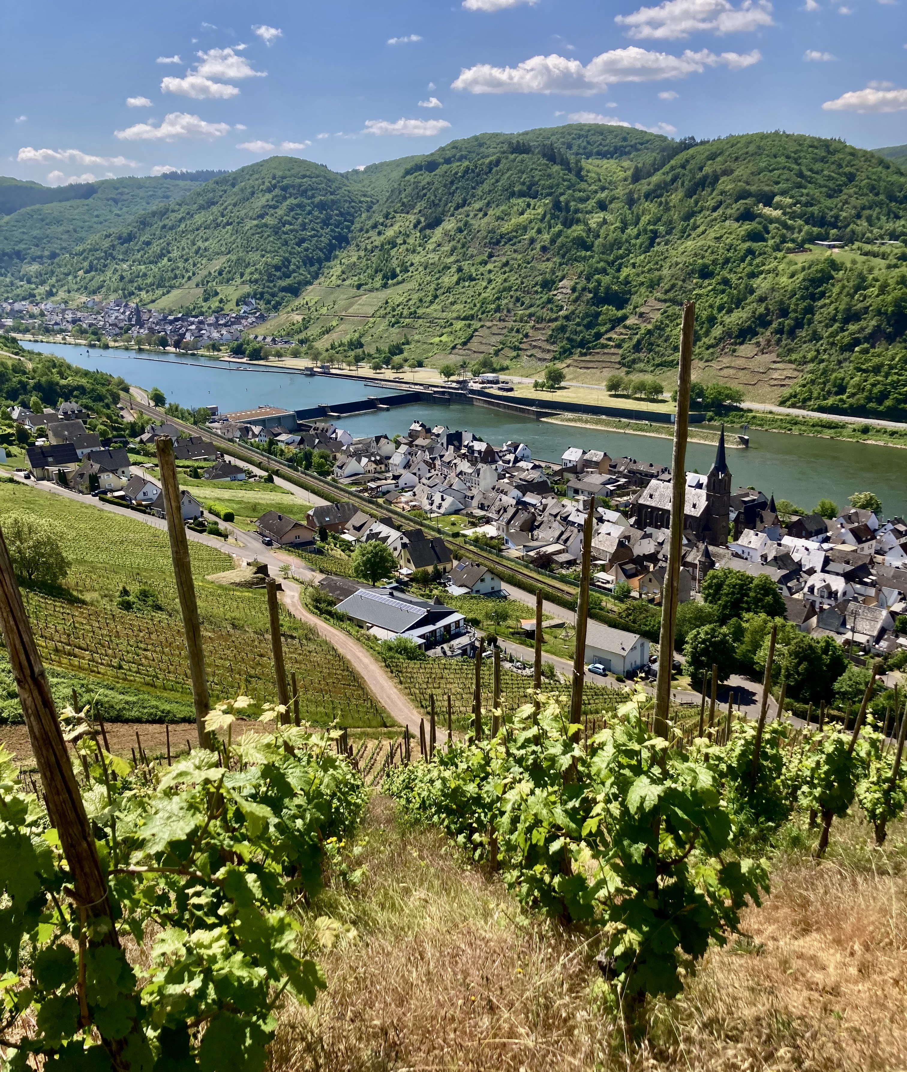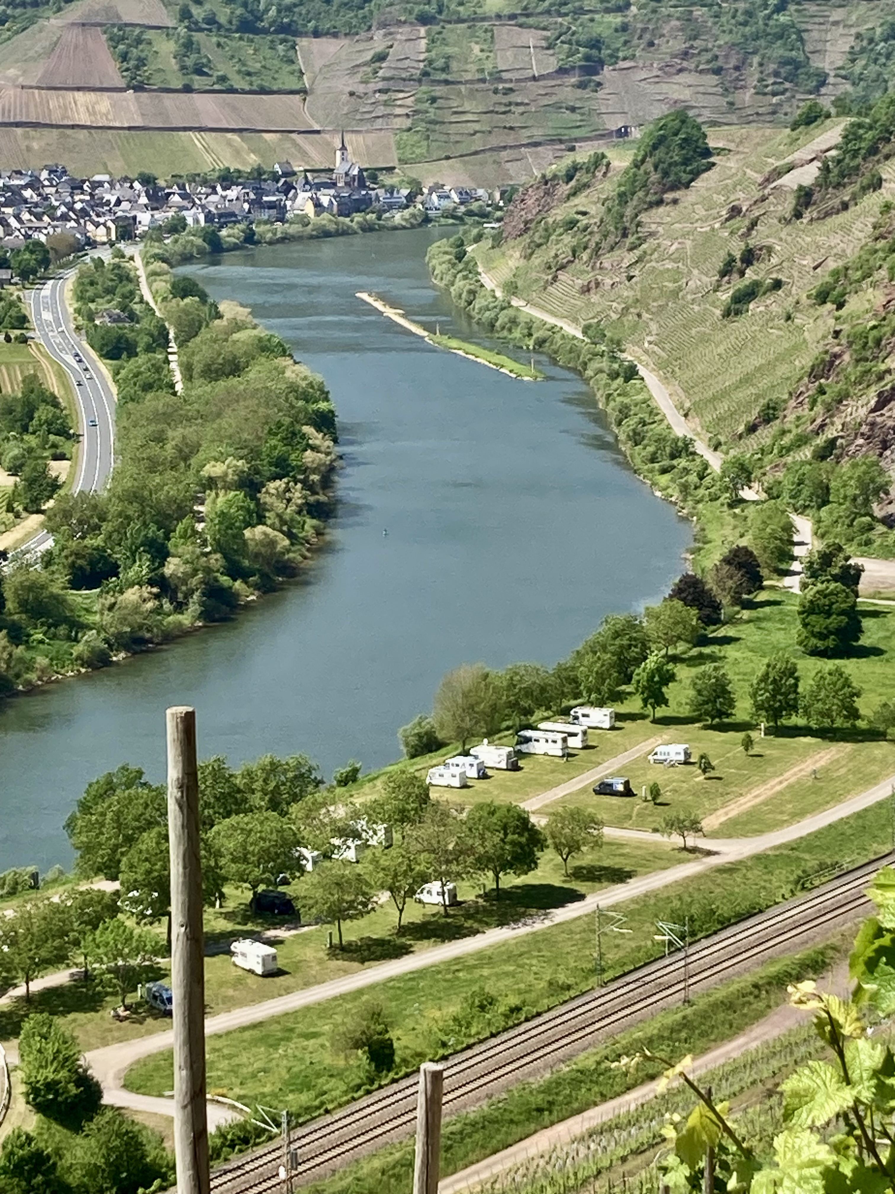 Nun starteten wir zur eigentlichen Moselfahrt, entlang des breiten gut schiffbaren Flusses, der sich mäandernd durch das Moseltal zieht. Um jede Ecke ein Ah und Oh. Links und rechts der Mosel nur Rebberge soweit das Auge reicht und das auf über 130 km. Wer sauft den soviel Wein, lieblich, halbtrocken oder trocken. Fast an jeder Ecke ein Weinautomat und du hast die Qual der Wahl eben zwischen lieblich, halbtrocken oder trocken. Wir haben uns für den Halbtrockenen entschieden. Der liebliche ist für mich Zuckerwasser. Alle rund 2 km hat es einen Stell- oder Campingplatz. Da brauchst du dir keine Sorgen zu machen, um einen Platz zu finden. Auf die ganze Moselstrecke Koblenz-Trier aufgeteilt sind es über 80 Plätze. Immer prächtig und bequem meistens am Wasser gelegen. Links und rechts der Mosel bestens ausgebaute Radwege. So konnten wir von einem Standplatz beidseitig in alle Richtungen fahren. Teilweise ging es auch hoch auf den Hügelzug per Radl. Einige Male haben wir auch unsere Wanderschuhe geschnürt und sind die rund 300 Höhenmeter auf- und wieder runtergestiegen und haben die tolle Aussichten genossen. Wettermässig war es der Hammer. Neun Tage verlustierten wir uns an der prächtigen Mosel, sei es per Rad oder zu Fuss oder auch mit einem Schlossbesuch in Cochem oder bewunderten vom Hügel aus die berühmte Brehmschleife, die engste Schleife der Mosel. Wir notierten in unserem Tagebuch über 140 Radkilometer und 5x haben wir den Stellplatz gewechselt. Wir lassen die Bilder sprechen.