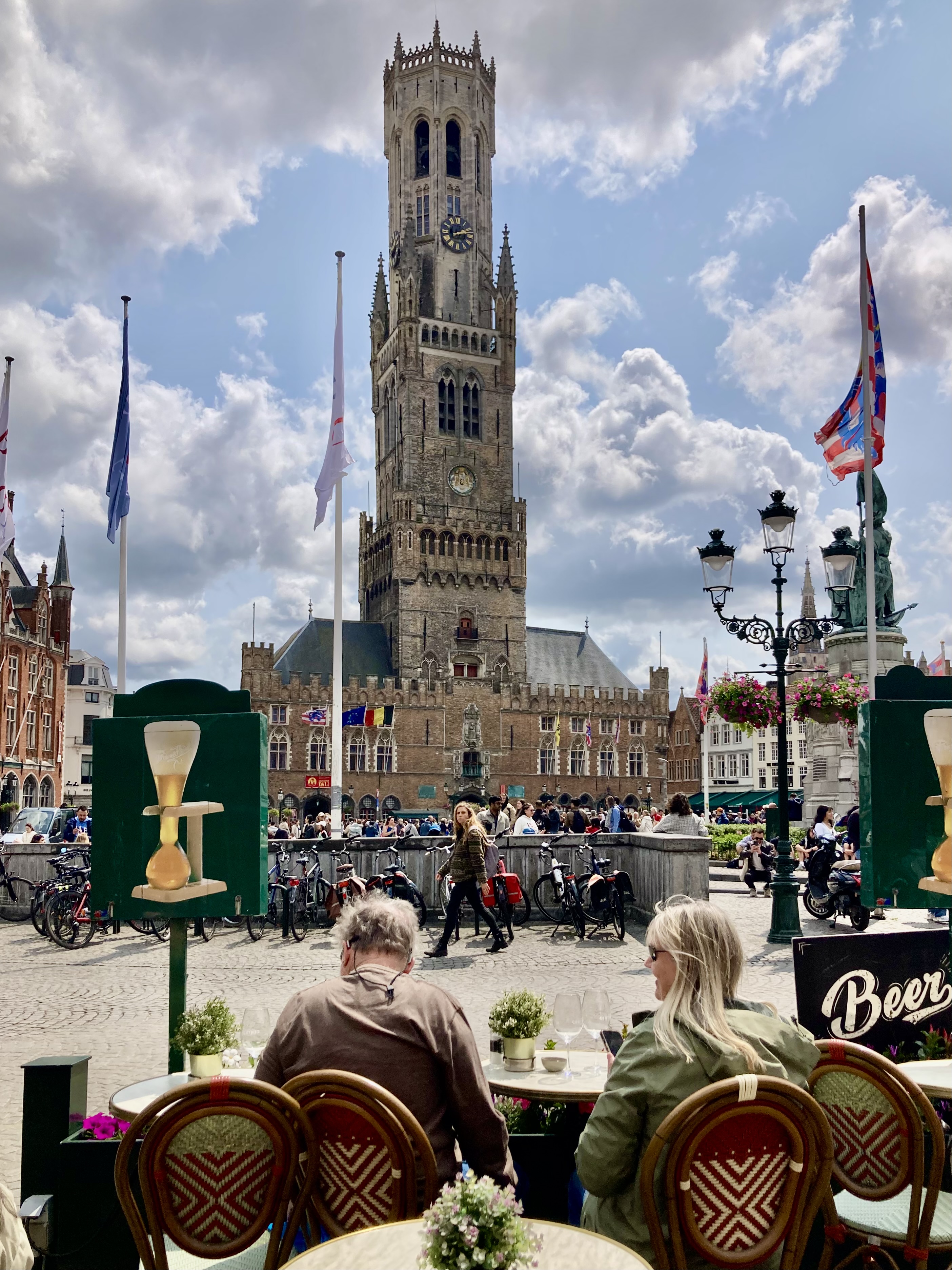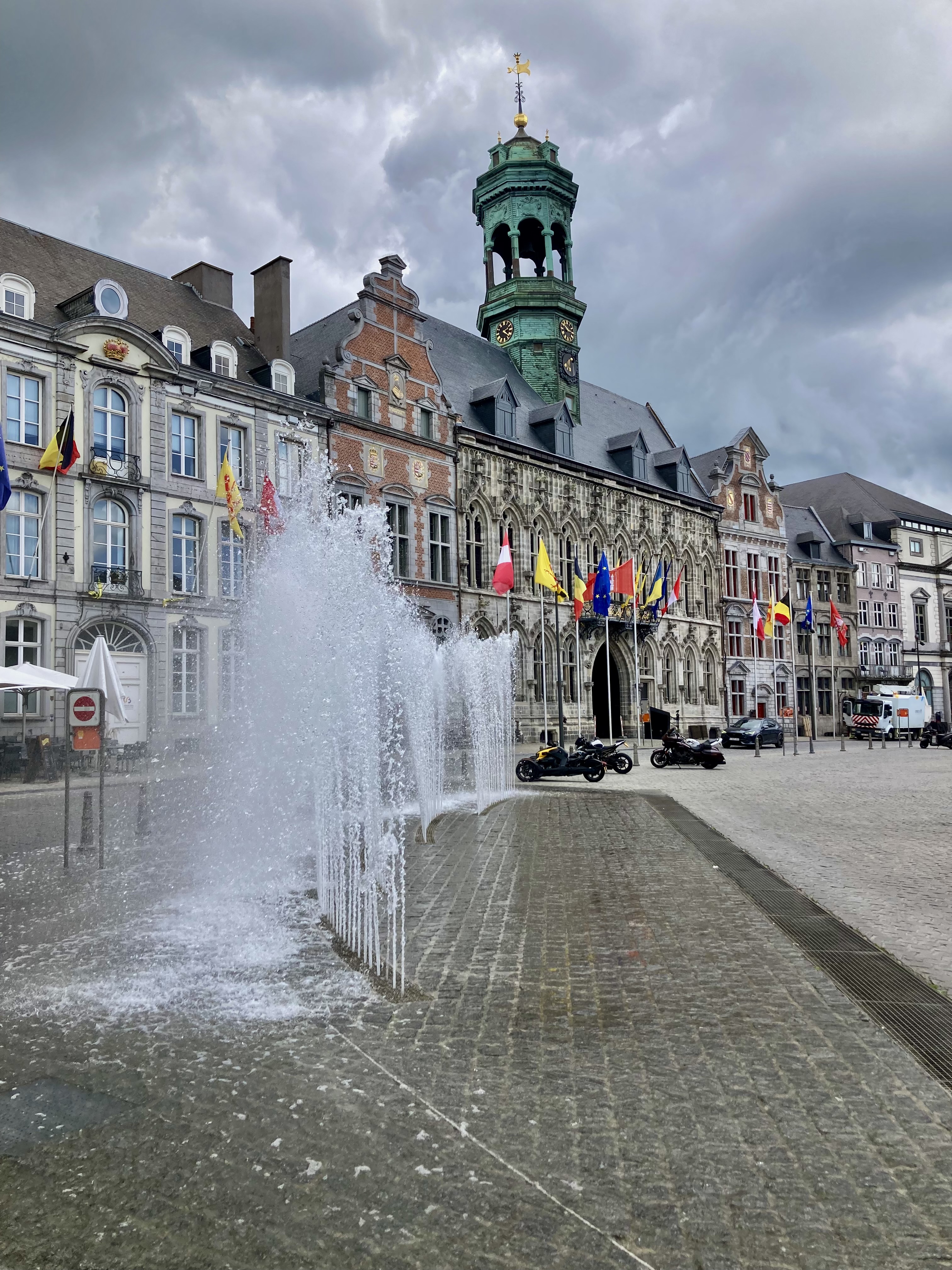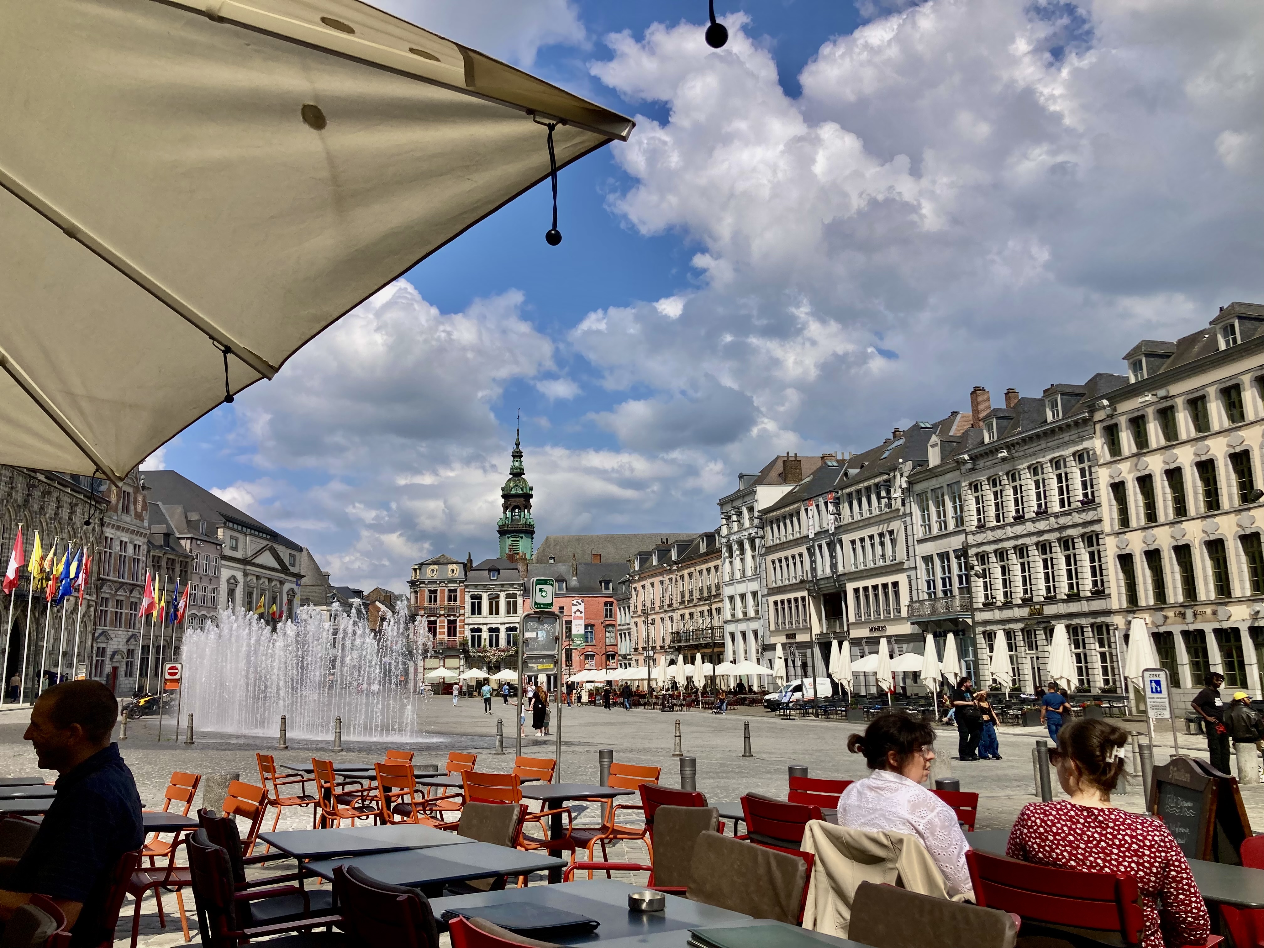Mons sagte uns nichts, doch wir wurden zünftig überrascht. 30 Minuten Fussmarsch in die Stadt zuerst am Bahnhof vorbei. Was für ein Bahnhof, eine Kathedrale von Calatrava. Sensationell, wunderschön. Aber auch die charmante Altstadt hat es in sich. Das sah so aus, als fühlten wir uns ins 18. Jahrhundert versetzt. Kopfsteinpflaster, alte prächtige Bauten und dann der Grand Place, ein Häuserviereck vom feinsten. Selbstverständlich liessen wir uns in einem neckischen Restaurant an der Front nieder. Doris mit Cüpli und ich wie immer mit dem vielversprechenden Belgischen Bier sogen das Leben auf dem Platz ein.