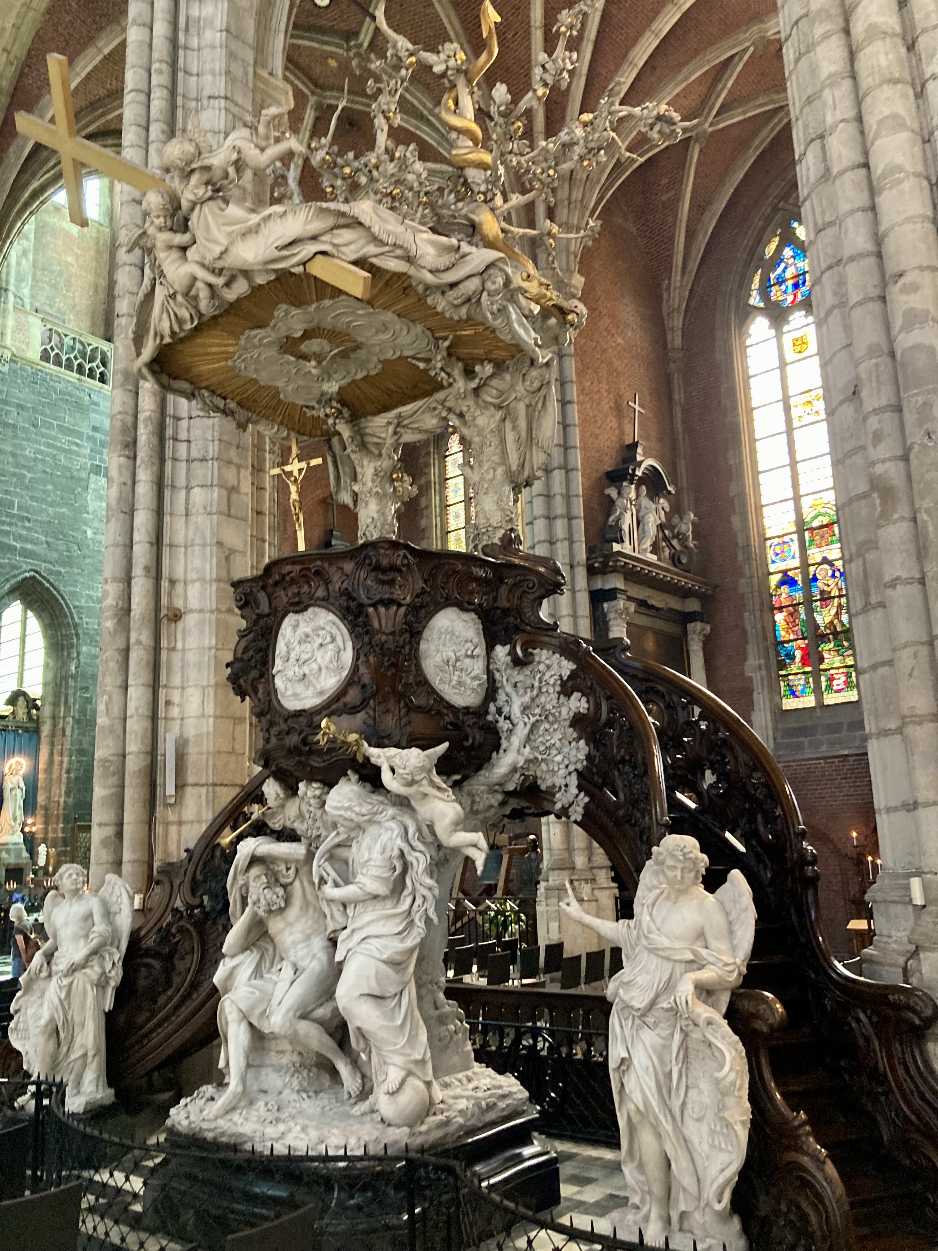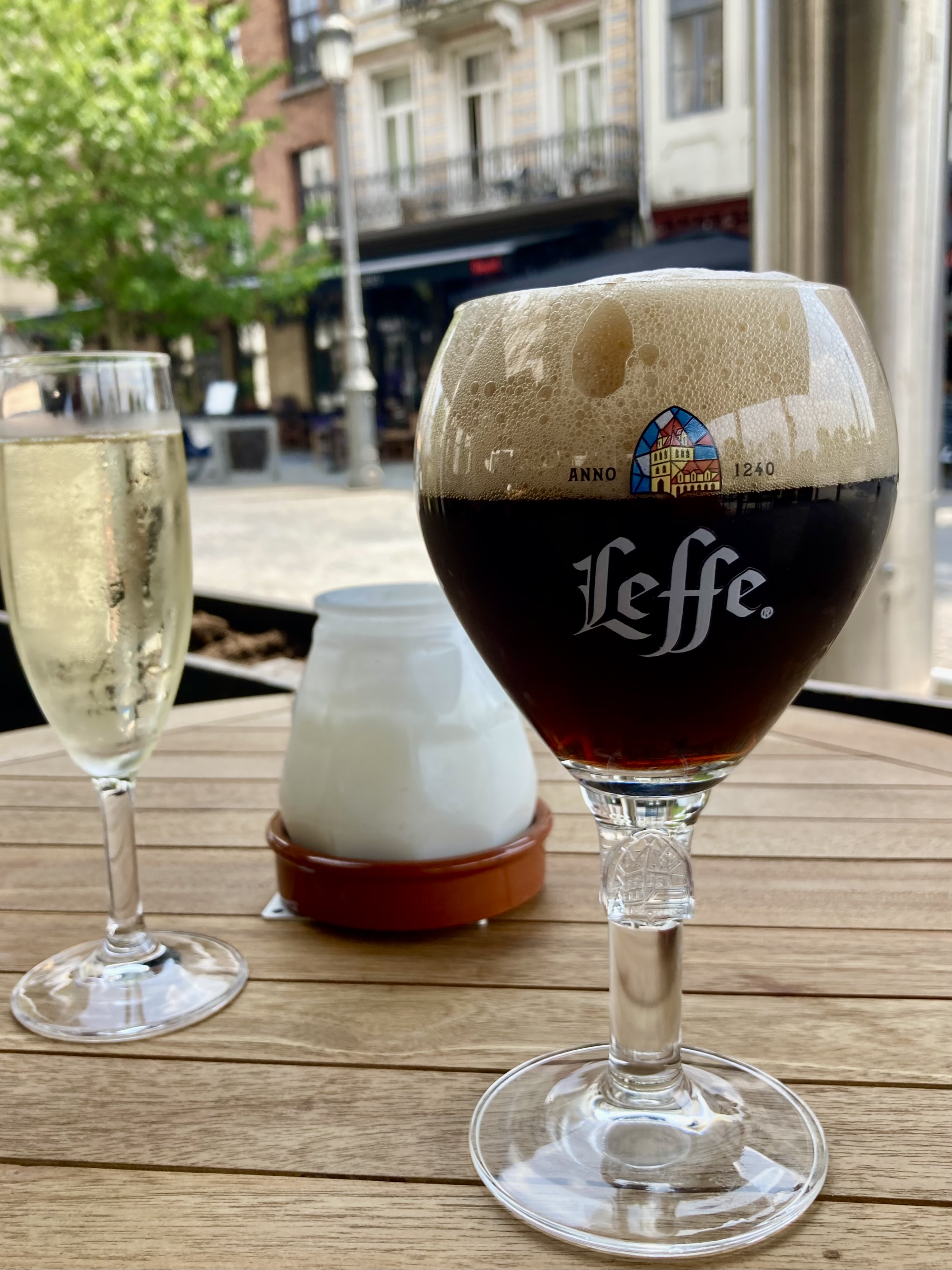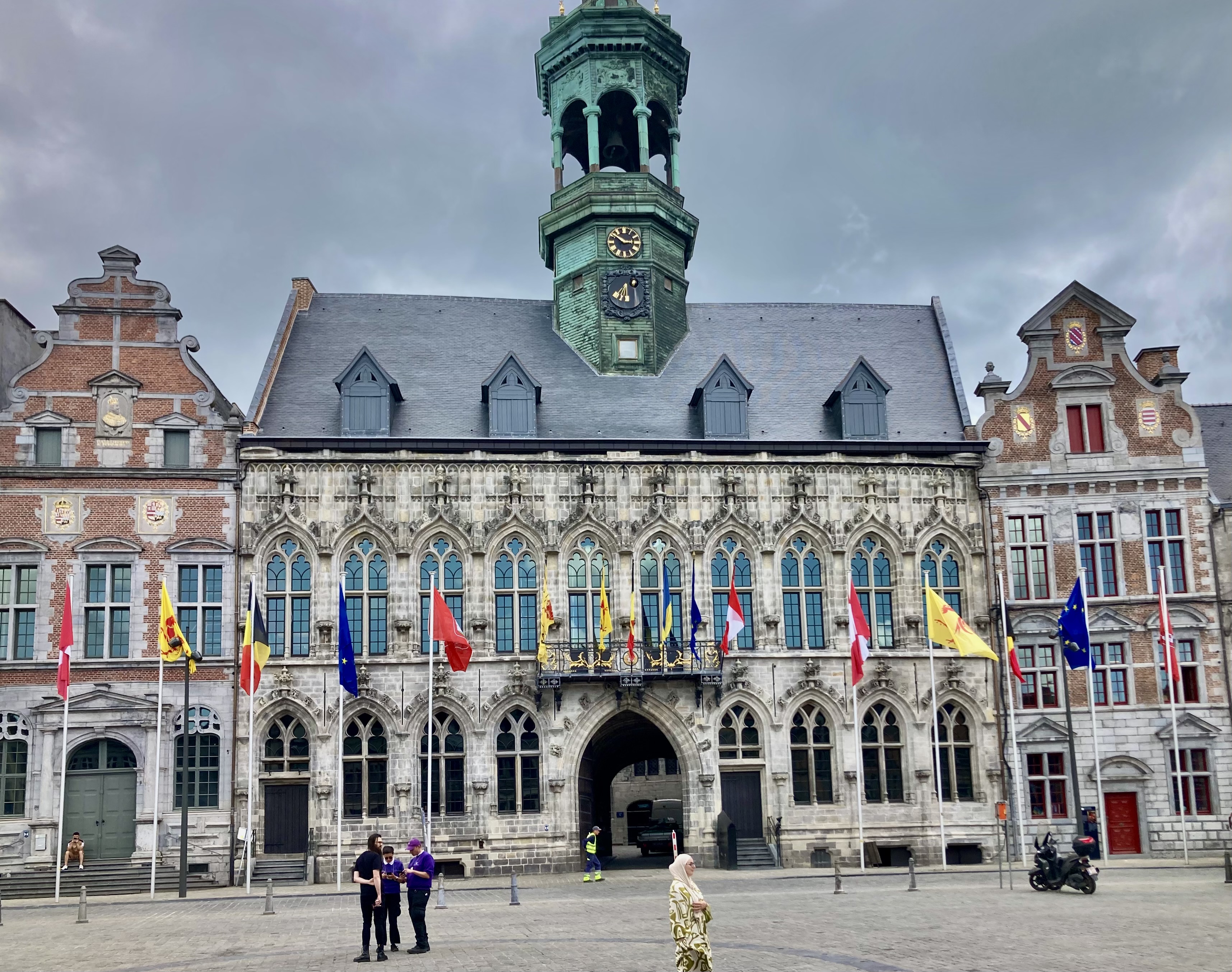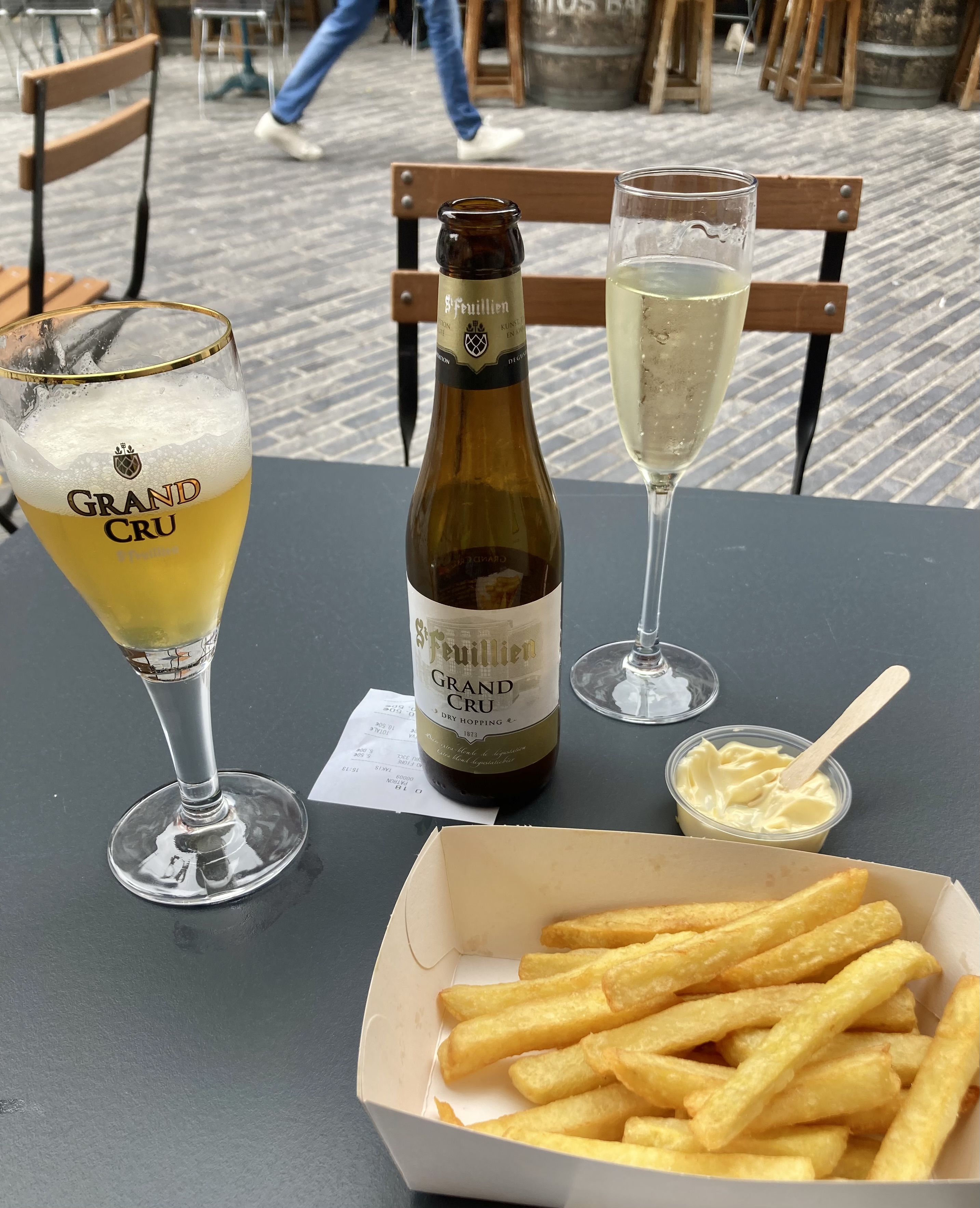 Mons sagte uns nichts, doch wir wurden zünftig überrascht. 30 Minuten Fussmarsch in die Stadt zuerst am Bahnhof vorbei. Was für ein Bahnhof, eine Kathedrale von Calatrava. Sensationell, wunderschön. Aber auch die charmante Altstadt hat es in sich. Das sah so aus, als fühlten wir uns ins 18. Jahrhundert versetzt. Kopfsteinpflaster, alte prächtige Bauten und dann der Grand Place, ein Häuserviereck vom feinsten. Selbstverständlich liessen wir uns in einem neckischen Restaurant an der Front nieder. Doris mit Cüpli und ich wie immer mit dem vielversprechenden Belgischen Bier sogen das Leben auf dem Platz ein.