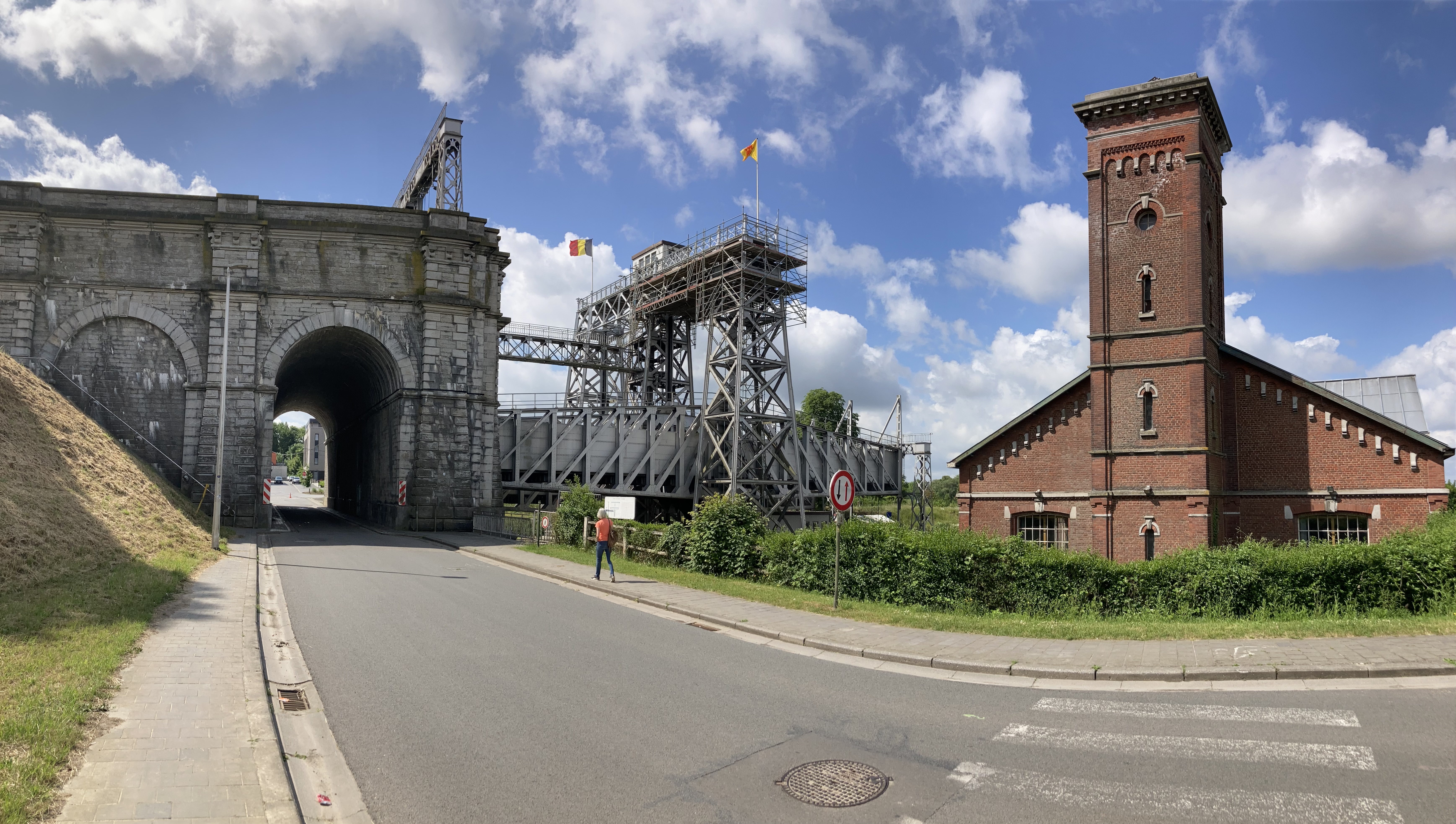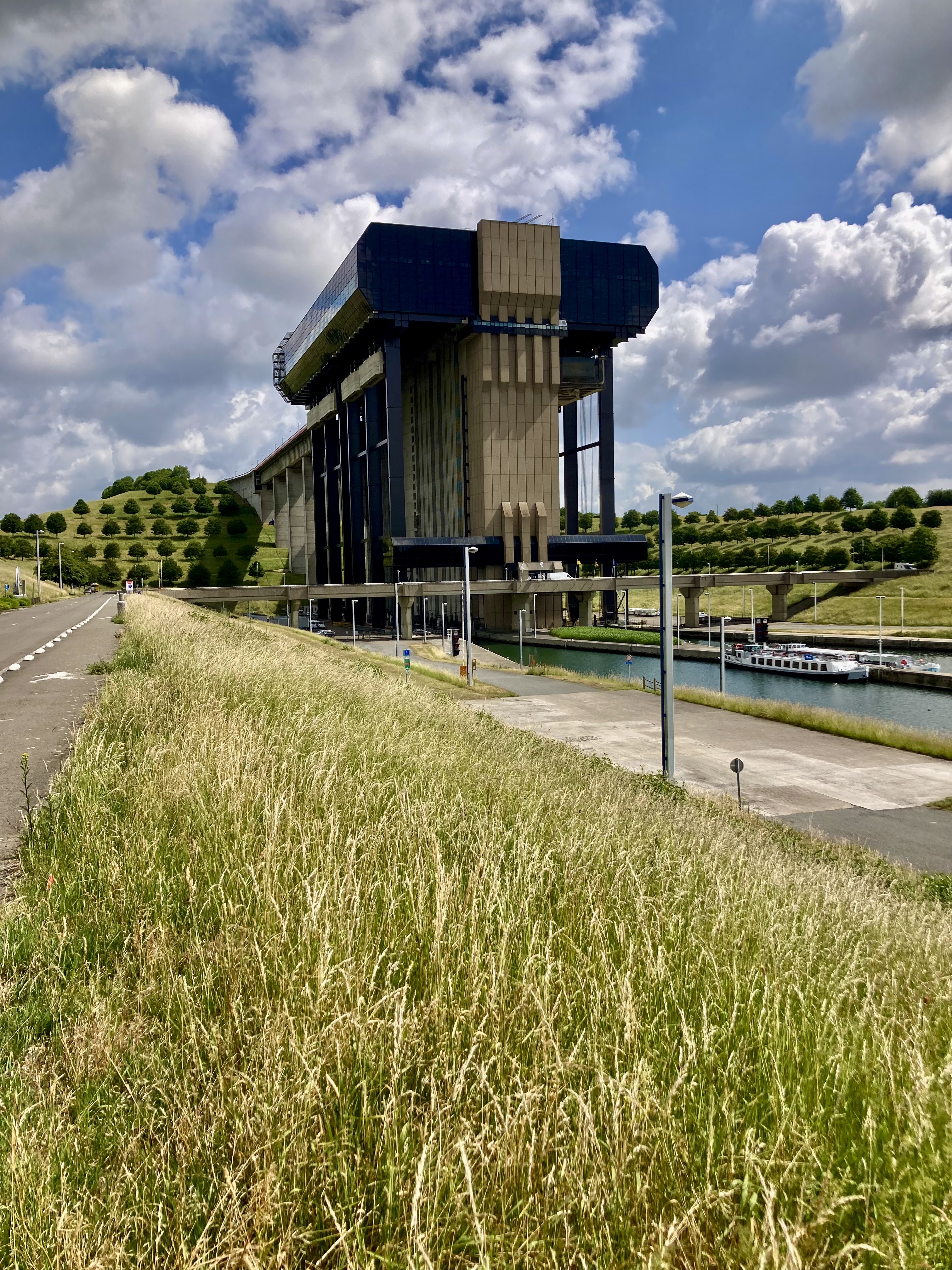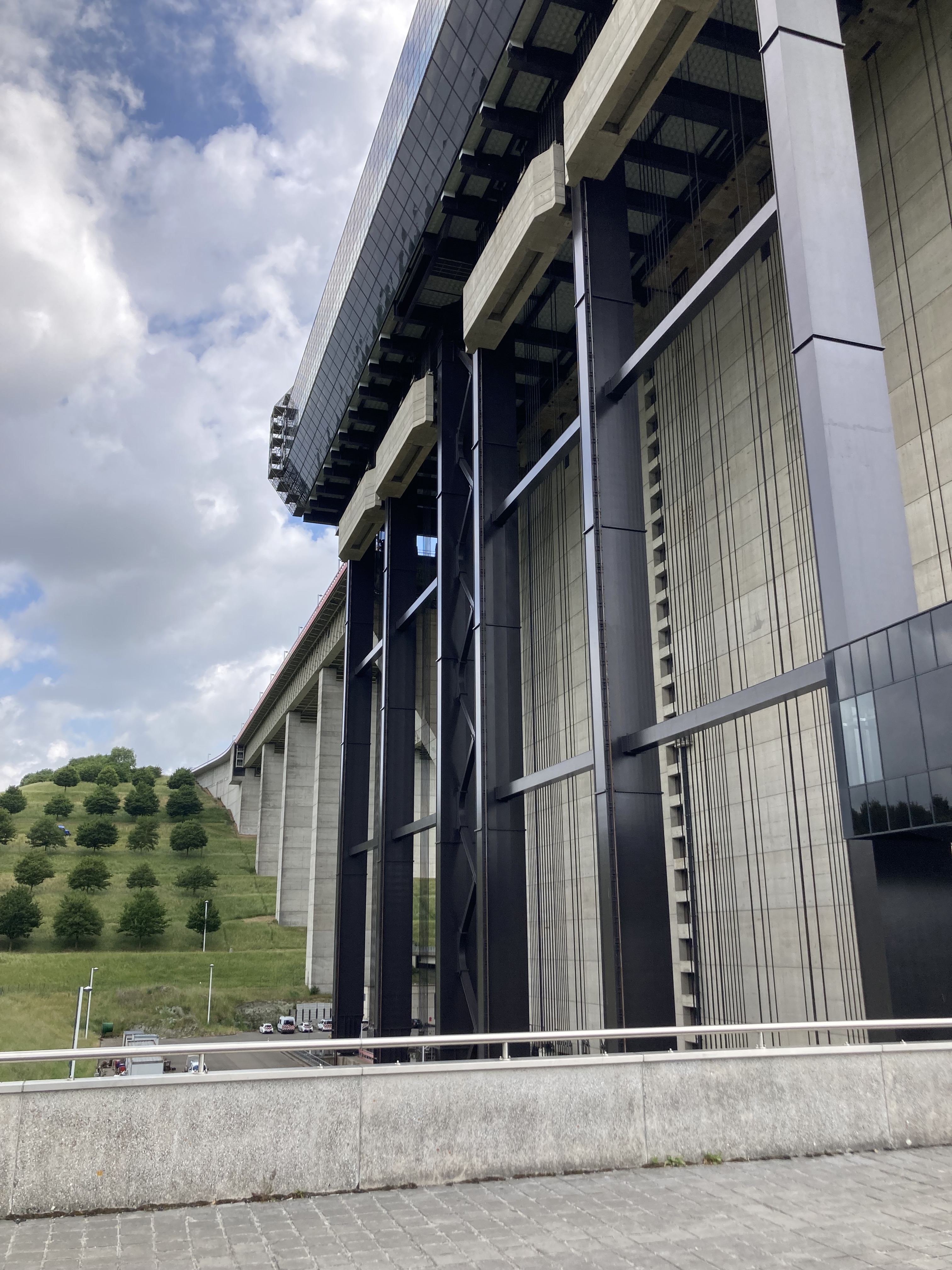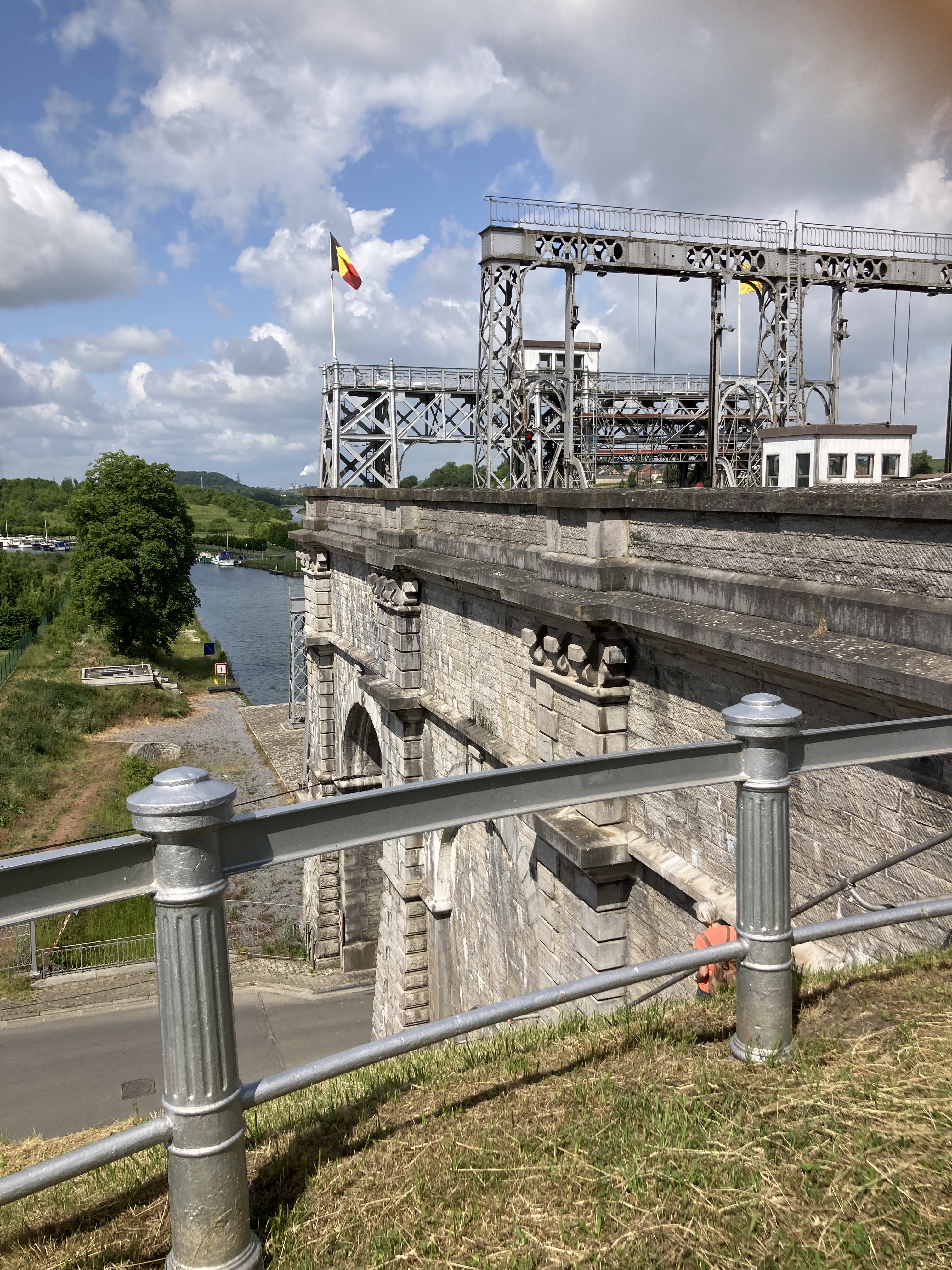 Bevor wir Mons erreichten, fuhren wir zu den eindrücklichen Schiffshebewerken, die ja gerade am Wege lagen. Da waren zuerst das alte, resp. vier alte Hebewerke, die die Schiffe 17m hoben. Nun wurde ein neuer Kanal gebaut mit nur einem Hebewerk, das die Schiffe in einem Zug über 70m hoch hebt in einer Wanne von über 100m Länge. Ein riesiges Bauwerk das Eindruck macht. Was wir auch eindrücklich fanden, war der anschliessende Kanal, der hoch über den Strassen liegt und wir im Kreisel unten durchfahren mussten.